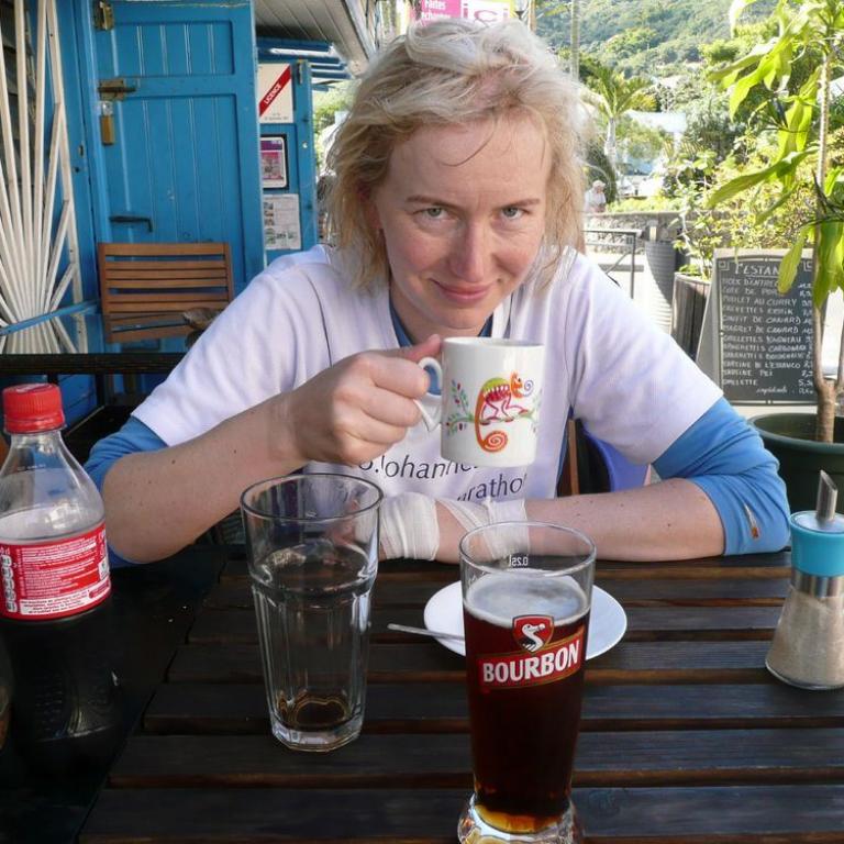 In Cilaos kauften wir uns noch eine Kleinigkeit zum Essen, bevor es die über 400 Serpentinen wieder von der Hochebene nach unten ging. Immer wieder erhaschten wir während der Fahrt einen Blick auf unsere zwei bestiegenen Berge, den Piton de Neiges und den La Grand Benare. Unser nächstes Ziel war das weiße Dorf LÈntre Deux. Die relativ schlaflose Nacht und Besteigung des Dreitausenders zeigte seine Wirkung, so dass wir im Auto am Parkplatz kurz eine Schaffenspause von einer halben Stunde einlegen mussten. Danach starteten wir zum kurzen Rundgang mit Einkehr auf einen Kaffee und kleines Bier. Am Nachmittag erreichten wir unser heutiges Ziel, die Ortschaft Grand Bois, wo Brigitte und ich unser Hotel für die nächsten zwei Tage bezogen, das 3 Sterne und direkt am Meer liegende La Victoria. Unsere erste Aktion, war ein Sprung in den Pool und anschließendem Besuch der Liegestühle. Um 19 Uhr gingen wir zum Abendessen in unser Hotel. Bestellt hatten wir für 20 Euro ein 3 Gänge Menü und dazu tranken wir Rum und das altbekannte Dodo Bier. Wir bekamen als Vorspeise Salat mit Fleisch Tartar, als Hauptspeise Steak und Brigitte Fisch und als Nachspeise Banane mit Eis. Wir waren von dem hervorragendem Essen sehr positiv überrascht.