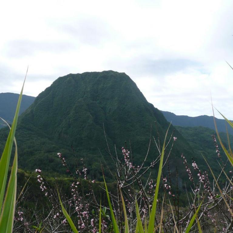 Wir wanderten durch die Ortschaft und bogen dann ab in Richtung Osthang des Cirques. Zuerst ging es vorbei an riesigen Bambusbäumen und dann weiter steil den Berg hinauf. Teilweise war der Weg mit Stahlseilen gesichert. Nach ca. 1 Stunden erreichten Brigitte und ich eine Talsenke, wo Kalla Blumen und Fuchsien wachsen. Nach weiteren 10 Minuten erreichten wir das Panoramaplateau der Hütte "Gite de Belouve" auf 1500 Höhenmetern. Von hier hatten wir einen herrlichen Ausblick auf den Piton de Neiges.