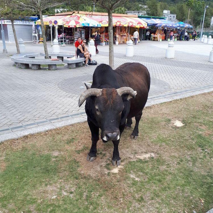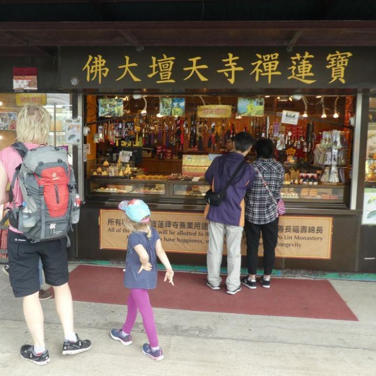Nach der etwa 25-minütigen Fahrt kommt man im Ngong Ping Village an, einem kleinen Dorf, welches aber schon sehr touristisch eingerichtet ist. Wir marschierten hindurch in Richtung Big Buddha. Einst ein einsames Kloster eingebettet in eine üppige Berglandschaft fand 1993 das Po Lin Kloster mit der Errichtung der außergewöhnlichen Tian Tan Buddhastatue (inoffizell auch als "Big Buddha" bekannt) seinen Platz auf der Weltkarte. Sitzend, 34 Meter hoch und den Blick nach Norden gen China gerichtet, zieht der majestätische bronzene Buddha Pilger aus ganz Asien an.