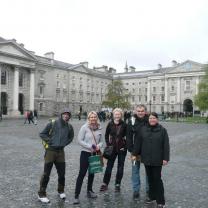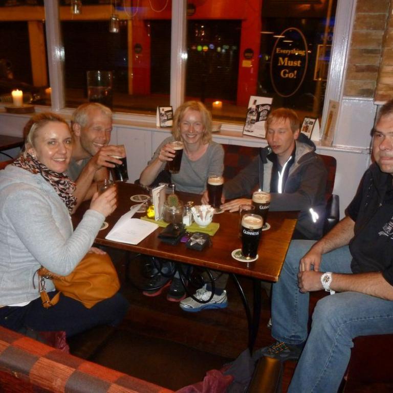 Früh Feierabend hieß die Devise am Mittwochnachmittag. Dann 14 km auf der Bahn laufen, kurz ins Freibad für ein paar Meter schwimmen und dann ab zu Sabine, wo wir uns alle trafen. Alle? Brigitte, Rainer, Sylvi, Hans, Sabine und ich. Der Flughafen München stand für die kleine Reisegruppe unter meiner Führung als erstes auf dem Plan. Geparkt wurde wie immer auf dem Urlauberparkplatz P41. Von dort brachte uns der Shuttlebus bis zum Terminal 1, wo wir bei Air Lingus, der bekannten irischen Fluggesellschaft eincheckten. Da wir noch Zeit hatten, genehmigten wir uns noch ein Bier und einen Snack im Flughafenrestaurant. Um kurz nach 20 Uhr hob dann auch schon unser Flieger mit Ziel Dublin ab. Um 22 Uhr Ortszeit erreichten wir die irische Hauptstadt. Ziemlich schnell bekamen wir unsere Koffer und fuhren mit dem Taxi bis zu unserem 3 Sterne Hotel: Dury Court Hotel im Temple Bar Bezirk. Nach dem Einchecken war auch noch Zeit für 2 Guinness an der Hotelbar, bevor wir uns im 6 er Apartment schlafen legten.