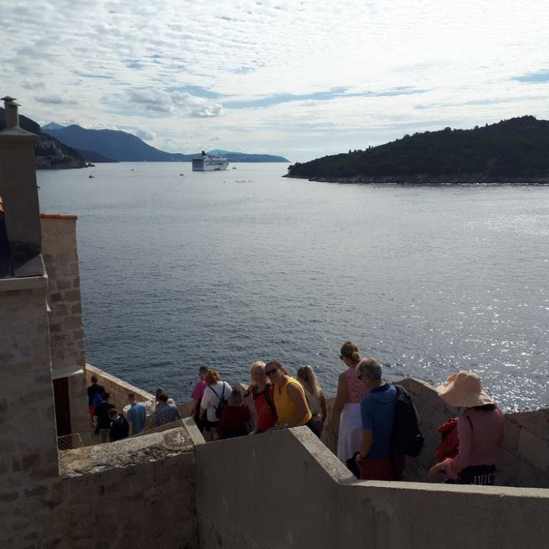Schon um dreiviertel 5 startete Zuhause unsere Reise gen Süden. Wir holten zuerst Dani, dann Rainer und Sylvia ab. Wir parkten direkt am Flughafen im P7 um Zeit zu sparen. Der Terminal 2 war unser Ziel. Da ich schon online eingecheckt hatte und wir nur Handgepäck mit uns führten, konnten wir direkt durch die Sicherheitskontrolle zu unserem Gate gehen. Nach einem kleinen Frühstück durften wir auch schon in den sehr kleinen Flieger von Croatia Airlines. Beim Einsteigen mussten wir schon die Köpfe einziehen um nicht anzustoßen :-) Der Flug dauerte knapp eine Stunde und wir bekamen sogar Getränke und einen kleinen Snack serviert, was gar nicht mehr so üblich ist. Wir landeten in Zagreb, wo wir 1 Stunden Aufenthalt hatten. Nach einer weiteren Stunde Flug erreichten wir den Flughafen von Dubrovnik, wo wir als erstes Geld wechselten.Bei Sonne und angenehmen 20 Grad holten wir unsere Familienkutsche bei Goldcar, einen Kia, ab. Auch hier konnten wir sofort starten, da ich ein Rundumsorglos Paket gebucht hatte. Nach 20 Minuten Fahrt erreichten wir unser Apartment mitten in Dubrovnik. Durch eine extrem enge Gasse rangierte ich unser Gefährt zum Ziel, wo wir sehr freundlich empfangen wurden. Das geräumige Apartment hatte 3 Schlafzimmer und einen großen Wohnraum mit Küche. Wir bekamen eine Flasche Wein und frisches Obst als Begrüßungsgeschenk. Nach einer kurzen Pause marschierten wir auch schon los in Richtung Altstadt, die zum UNESCO Weltkulturerbe zählt. Wir erreichten nach gut einer halben Stunde Fußmarsch das westliche Pile Tor, von wo wir einen herrlichen Blick auf die alten Stadtmauern hatten. Über die Hauptpromenade ("der Stradun") gelangten wir bis zum alten Hafen. Eigentlich hatte ich für uns "Game of Thrones" Fans, eine Schiffs - und Walking Tour reserviert. Leider bekam ich falsche Zeitangaben, sodass wir nur noch die Walking Tour genießen konnten. Hier wurden wir zu den Originalfilmschauplätzen der Serie geführt und dazu die Handlung anhand von Bilder der Filmsequenzen erklärt. Wir fanden die Tour sehr interessant und kurzweilig. Später am Abend gingen wir noch in einer kleinen Gasse zum Essen, bevor wir zurück zur Unterkunft marschierten und kaputt in die Federn fielen.