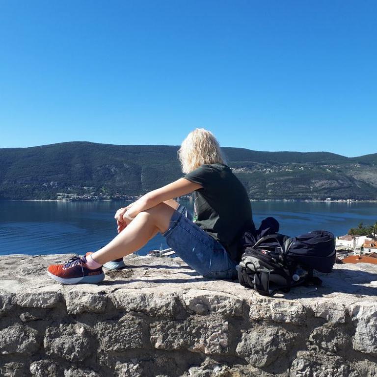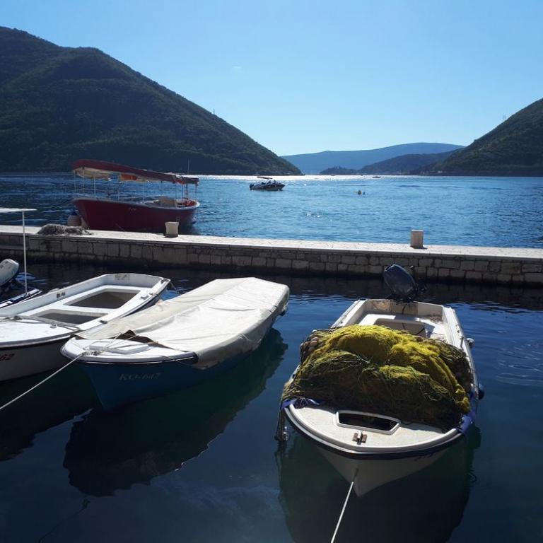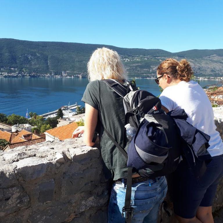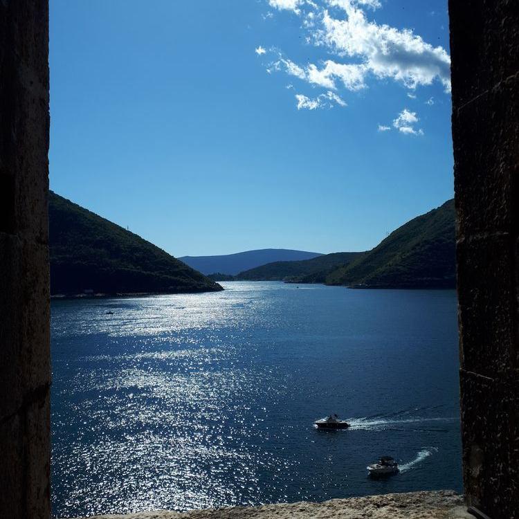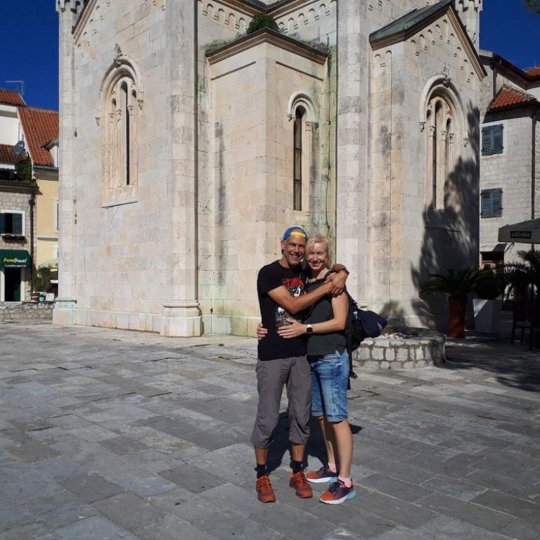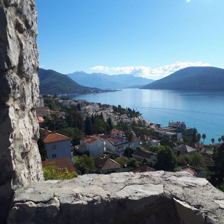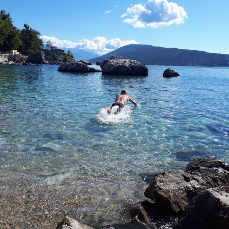 Auch heute lief ich mit Brigitte vor dem Frühstück eine Runde durch Dubrovnik. Das Wetter meinte es gut mit uns, da bei angenehmen 20 Grad keine einzige Wolke zu sehen war. Nach dem Frühstück rangierte ich mit Rainers Hilfe unser Gefährt aus dem Parkplatz und der engen Gasse. Wir fuhren an der Küste in Richtung Süden. Nach knapp einer Stunde erreichten wir die Grenze zu Montenegro. Nach der problemlosen Grenzkontrolle fuhren wir zum Badeort Herceg Novi. Hier besichtigten wir die herrliche Altstadt mit seiner Burg und den vielen Treppen. Wir genossen den Panoramablick in die Bucht von Kotor und die vorgelagerten Inseln. Klar sprang ich auch ins kristallblaue Wasser und legte eine kleine Schwimmeinheit ein, bevor wir uns in einem kleinen Cafe stärkten.