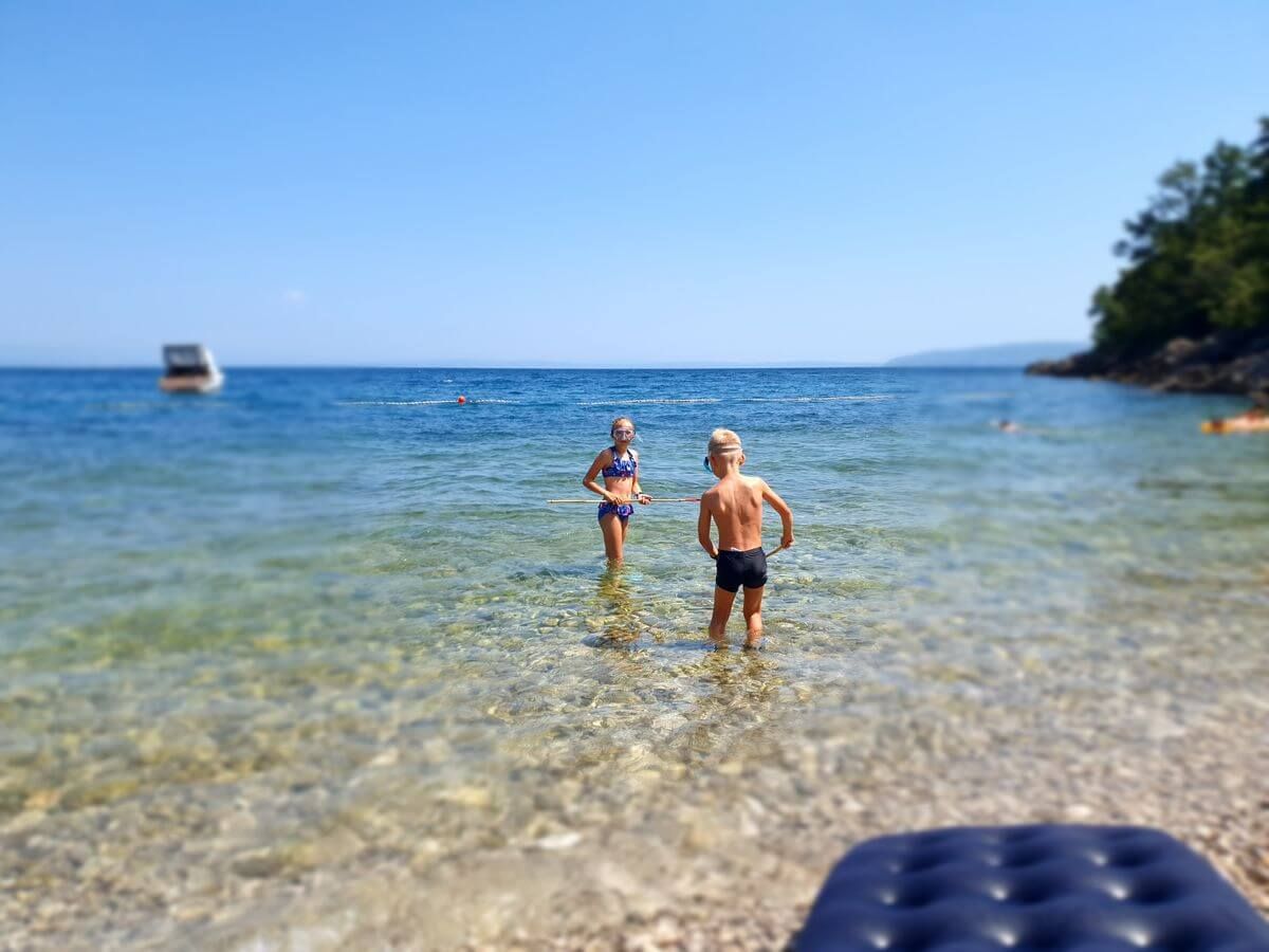 Auch an diesem Tag wollten wir einen weiteren Strand erkunden. Wieder fuhren wir einige Kilometer in Richtung Süden bis zum Örtchen Mošćenička Draga. Wir fanden einen Parkplatz und marschierten ein paar Meter bis zum schönen Kiesstrand Sipar. Er besteht aus feinem Kies und bietet dadurch besonders klares, sauberes Wasser – ideal zum Schwimmen und Schnorcheln.