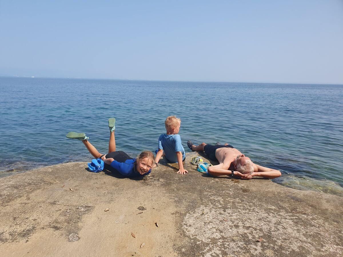 Wir gingen bis an das südliche Ende, wo es schöne, felsige Buchten gibt. Beim Schnorcheln entdeckten wir einen Tintenfisch, der sich an meinen Armen festsaugte, viele Krebse und einen Seestern. Natürlich ließen wir den schönen Seestern im Wasser, denn an der Luft würde er sterben. Von einem Felsen konnte man perfekt ins Wasser springen. Am Abend aßen wir ein leckeres Menü auf unserem Balkon und spielten anschließend lustige Gesellschaftsspiele.