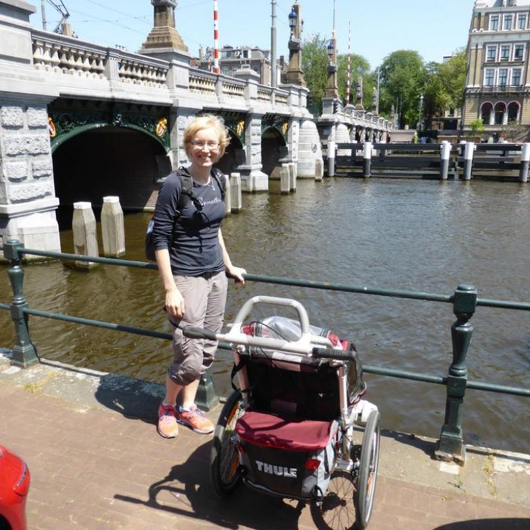 Erst um 18 Uhr wachten wir wieder auf. Frisch und munter starteten wir noch bei herrlichem Sonnenschein zum Abendspaziergang. Wir marschierten durch den Grachtenring und bestaunten die gemütlichen Cafe`s und Geschäfte. Wir kauften uns Käse, Baguette und Bier und setzen uns auf eine Bank in der Sonne, aßen und beobachteten die unterschiedlichen Leute. Multikulti kann man da nur sagen. Nur schwer konnten wir uns von der herrlichen Kulisse trennen, aber da es schon nach 20 Uhr war, sollte unsere kleine Weltenbummlerin doch mal ins Bett, auch wenn es ihr hier draussen noch super gefiel. Langsam spazierten wir vorbei an der Blauwbrug und Magerebrug zurück ins Hotel. Ein ereignisreicher und schöner Tag ging langsam zu Ende.
