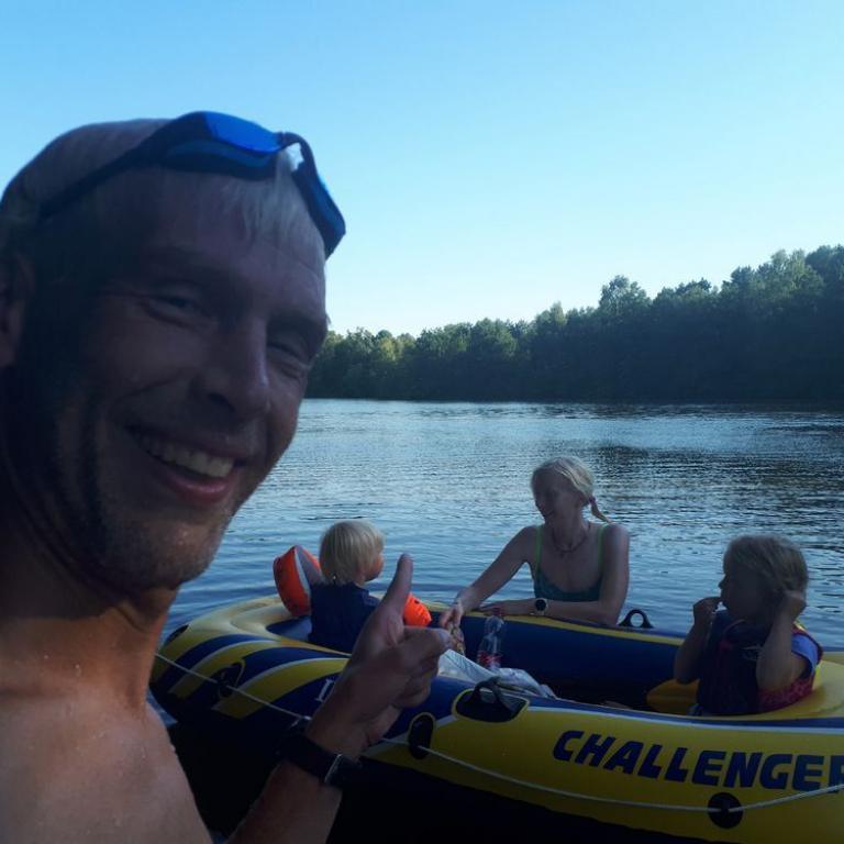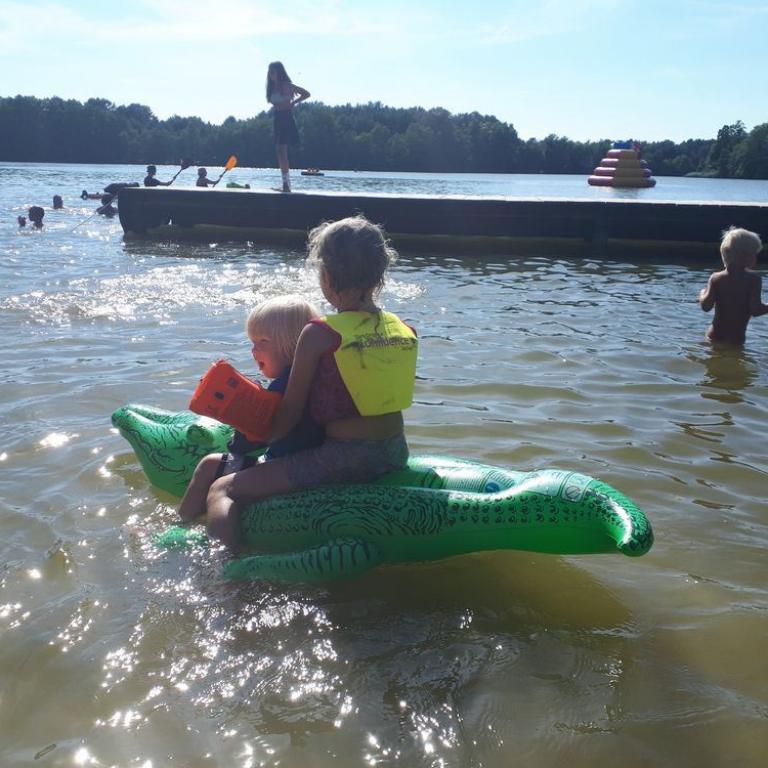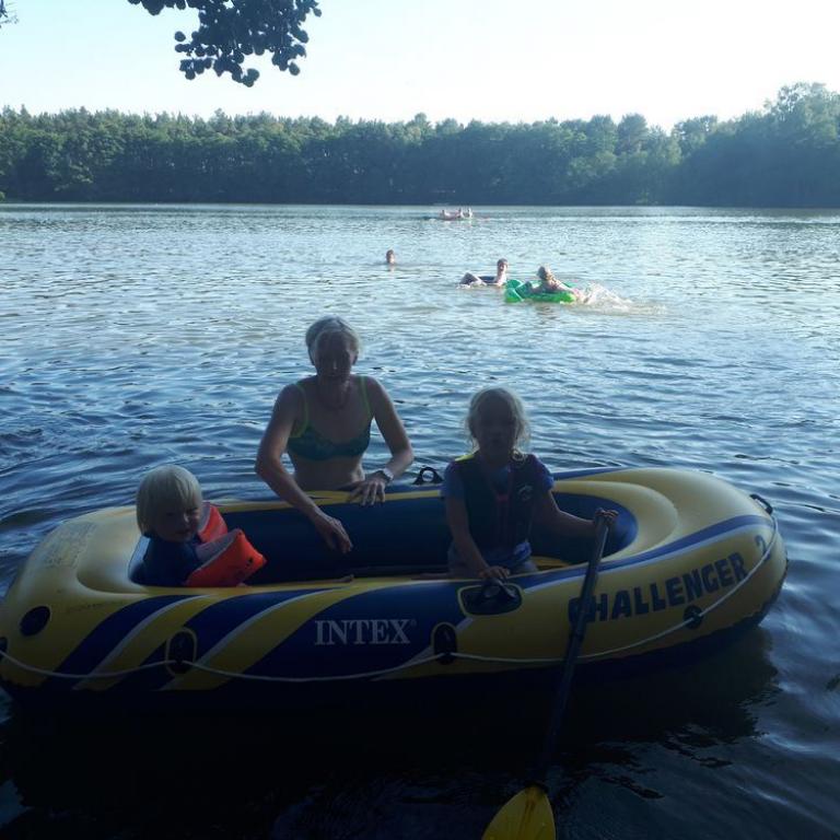 Erst um 8 Uhr kamen wir aus den Federn. Leider hatte Emma Durchfall. Wahrscheinlich waren die vielen Achterbahnfahrten am gestrigen Tag doch etwas zu viel für die kleine Maus :-) Somit wollten wir diesen Tag etwas ruhiger verbringen. Leider musste Emma immer wieder auf die Toilette. So schön der Campingplatz und seine Lage auch war, aber die Sanitäranlagen waren ziemlich verdreckt und veraltet. Aber Augen zu und durch, bzw. Nase zu :-) Emma ging es schnell besser, so dass wir am Naturkinderbadestrand baden konnten. Ich schwamm den gesamten See ab und kam auf 2 Kilometer. Zwischendurch legte ich auch noch eine 10 Kilometer Laufeinheit ein und am späten Nachmittag pumpte ich unser Boot auf, um eine Runde auf dem See zu paddeln bzw. schwimmen. Ich hing mir ein Expander Seil um und zog das Boot mit den Kindern im Kraulstil durch den See. Puhhh das war ziemlich anstrengend, dafür ein super Training :-) Am Abend kochten wir uns Nudeln mit dem Gaskocher und dazu gab es eine eisgekühlte Radler...