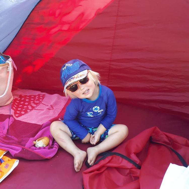 Ich schrieb bis in die Nacht meinen Reisebericht. Weit nach Mitternacht raschelte es vor dem Zelt. Mit der Stirnlampe bewaffnet fand ich in unserer Abfalltüte einen Igel, der sich unsere Nudelreste schmecken ließ :-) Es war also kein Einbrecher und ich konnte somit beruhigt ins Bett gehen... Brigitte lief eine Morgenrunde, während wir noch schliefen. Dann gingen wir baden im Campingplatzeigenen Naturbadeweiher. Nach dem Frühstück mussten wir unser Zelt umziehen, da wir einen Tag länger als geplant bleiben wollten und unser Platz heute wieder vergeben wurde. Nach Mittag radelten wir am Deich in Richtung St. Peter Ording entlang. Wir kamen bis zum kleinen Strand Everschopsiel, wo wir dank der Flut zuerst baden und dann bei einsetzender Ebbe im Watt marschieren konnten. In einem nahegelegenen Restaurant stärkten wir uns, um mit extremem Gegenwind zurück zum Zeltplatz radeln zu können :-) Den Abend ließen wir mit einer Brotzeit, Spielplatz und Film am Tablet ausklingen...