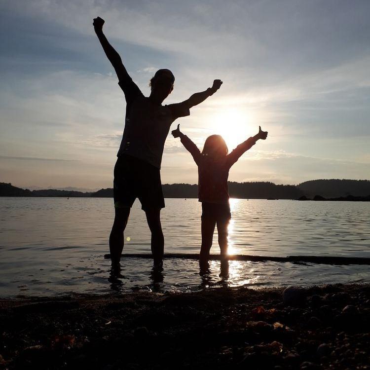 Am Morgen packten wir zusammen und frühstückten gemeinsam. Die Stärkung war nötig, da eine Kanutour geplant war. An der Rezeption des Campingplatzes konnten wir uns für 50 NOK die Stunde ein Kanu samt Schwimmwesten ausleihen. Wir paddelten auf dem Fluss Skarpesvingen landeinwärts. Der Fluss fließt direkt ins Meer. An vielen Stellen war der breite Fluss aber sehr seicht, so dass ich zweimal aussteigen und das Boot schieben musste :-) Auf einer kleinen Sandinsel legten wir an um Rast zu machen. Insgesamt waren wir 2 Stunden incl. Pause und 4 Kilometer unterwegs. Dann packten wir unsere Sachen ins Auto und putzten die Hütte, um dann die nächste sportliche Einheit starten zu können :-) Wir fuhren mit dem MTB direkt ab dem Campingplatz zu einsamen Stränden, wo wir die Füße ins Wasser hielten, Krebse suchten und Picknick machten. Traumhaft schön hier, so dass wir uns kaum losreißen konnten. Erst am späten Nachmittag fuhren wir weiter an der norwegischen Küste nordwärts. Nach nur 50 Kilometern in der Nähe von Feda fanden wir den kleinen Campingplatz "Svindland Camping", wo wir für umgerechnet 60 Euro eine einfache Hytter (=Hütte) bekamen. Brigitte zauberte ein leckeres Abendessen, während ich mit den Zwergen spielte. Später lief ich noch coole und einsame Trails, durch Matsch, Urwald und wegloses Gelände auf den 320 m hohen Rolla. Kurz vor Einbruch der Dunkelheit war ich von meiner 8 km 300 Hm Tour zurück in der Hütte. Ich dusche kalt, da ich keine Duschmarke hatte, aber es trotzdem dringen nötig war :-)