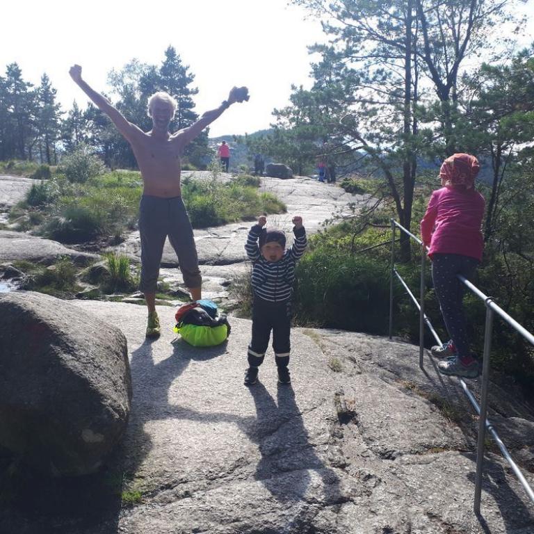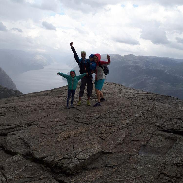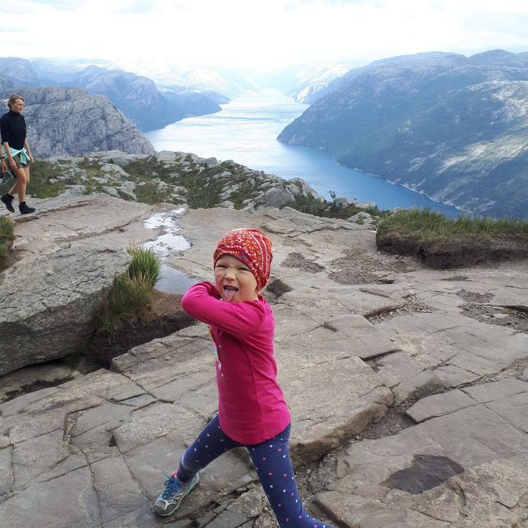 Nach dem Frühstück fuhren wir auf einem abenteuerlichen Forstweg, den ich gestern zufällig während meiner Bergtour gelaufen bin. Da mein Navi immer Recht hat, fuhr ich tapfer von einem Schlagloch in das nächste. Wir überquerten einen Pass bis zur Ortschaft Jorpeland, von wo wir auf die Straße zum Wanderparkplatz Preikestolen gelangten. Pünktlich fing es zu regnen und stürmen an :-( Nach ein paar Minuten und checken meiner Wetter App wollten wir, wie viele andere, die Wanderung auf den Preikestolen versuchen. Nach ein paar hundert Meter Aufstieg fing es zu donnern, blitzen und in den höheren Lagen zu hageln an. Mit gesundem Menschenverstand entschieden wir die Tour abzubrechen. Wir flüchteten ins Auto und mussten leider 25 Euro Parkplatzgebühren für nichts bezahlen. Zurück in der Unterkunft gab es ein kleines Mittagessen und Brigitte und Timi legten sich schlafen. In Norwegen ändern sich die Wetterverhältnisse schlagartig. Das hatten wir schon vor 9 Jahren während unserer damaligen Norwegenreise erfahren dürfen. Ich schaute zum Fenster hinaus und sah Sonne und blauer Himmel. Die Wetter App meldete ebenfalls ein 3 Stunden Schönwetterfenster. Meine beiden Schlafmützen kamen zufällig aus dem Bett gekrochen und wir entschieden die Tour ein weiteres Mal an diesem Tag zu starten. Also fuhren wir nochmals die abenteuerliche Strecke bis zum Parkplatz. Bezahlten natürlich ein weiteres Mal 25 Euro :-) Nun ließen wir uns aber nicht mehr aufhalten. Emma war hochmotiviert und stieg die Serpentinen nach oben. Die kleine Maus suchte sich die besten Trails. Timi saß vergnügt auf meiner Schulter und ich drückte die steilen Anstiege nach oben. Ganz klar war dies ein super Training für die Oberschenkel und Waden. Wir kamen in ein Sumpfgebiet, das wir über Holzstege überqueren konnten. Der Weg war super angelegt und wir stiegen die natürlichen Steintreppen nach oben. Die Aussicht wurde immer spektakulärer. Das Wetter hielt und immer wieder blitzte Sonne und blauer Himmel durch die Wolken. Zum Schluss gab es noch eine seilversicherte, leichte Kletterpassage. Und dann endlich kamen wir nach 1 Stunden Aufstieg zum berühmten Preikestolen. Von der ungesicherten Kante geht es 600 m senkrecht zum Lysefjord hinab. Es fing leicht zu regnen an und der Wind peitschte uns ins Gesicht. Natürlich riskierten auch wir einen Blick über die Klippe. Klar mit Abstand, da ich die Kinder nicht in Gefahr bringen wollte. Wir hatten trotz des Windes einen atemberaubenden Blick auf den Lysefjord und den umliegenden Bergen. Meine kleine Emma fing zu weinen an, denn sie hatte Angst ich könnte bei meinen Fotoshootings von der Klippe fallen :-) Brigitte stieg mit den Kindern langsam ab, während ich außer Sichtweite auf dem Bauch zum Rand der Klippe robbte und coole Fotos machte. Fast wäre aber ein Häufchen in der Unterhose gelandet :-) Der Blick nach unten ist nichts für schwache Nerven. Zurück hielt das Wetter noch immer. Manchmal regnete es leicht, aber die meiste Zeit war es trocken. Ich war mal wieder brutal Stolz auf meine Emma, die 9 km, 600 Höhenmeter in knapp über 3 Stunden geschafft hatte. Top fit die kleine Maus. Zurück in der Hütte fing es so richtig zu regnen an, was mich aber nicht vom Grillen auf der Terrasse abhielt. Es gab Würstel und Lachs. Dazu ein leckeres Bierchen. Später sauste ich mit Timi während einer Regenpause über den Campingplatz, bevor wir den Abend ausklingen ließen