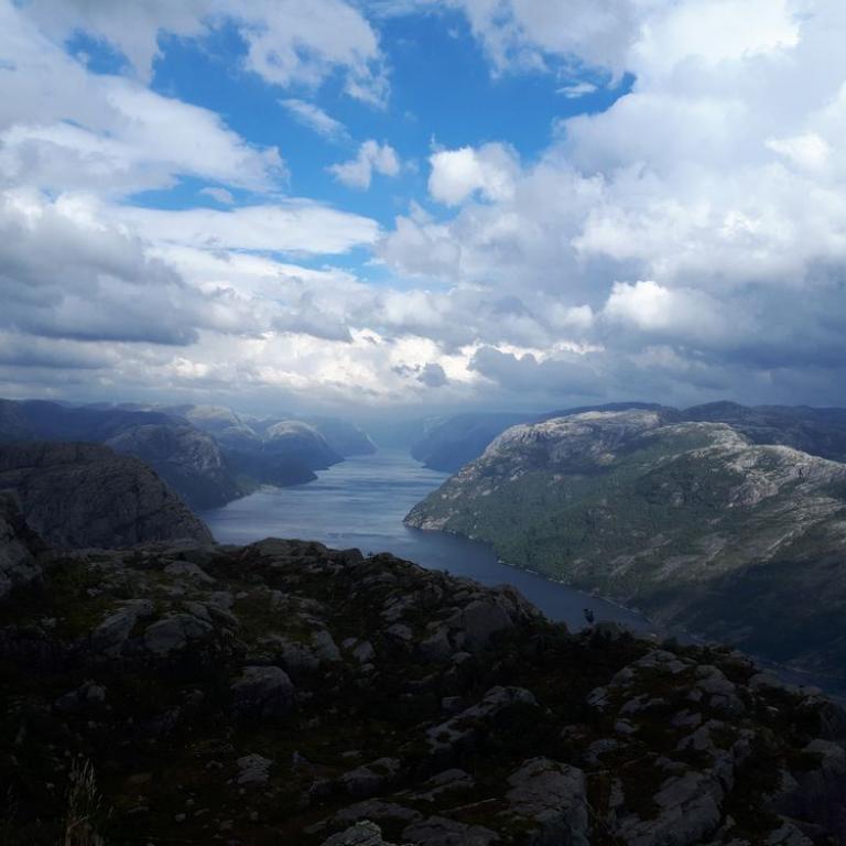 Am Morgen sah das Wetter noch ganz vielversprechend aus. Nach einem kleinen Frühstück konnte es auch schon wieder weitergehen. Unser erstes Ziel war das Städtchen Flekkefjord, wo wir Halt machten und durch das beschauliche Örtchen marschierten. "Hollenderbyen" heißt das älteste Stadtviertel des 9000 Seelen Städtchens und die klassischen Holzhäuser stehen mittlerweile sogar unter Denkmalschutz. Wir gingen in kleine Geschäfte, an den Hafen und natürlich zum Spielplatz :-) Kurz vor Mittag fing es zu Regnen an und wir setzten unsere Reise fort. Auf der Panoramastraße RV44 fuhren wir über Egersund bis Stavanger. Leider regnete es in Strömen, so das wir die Aussicht auf die Mini Fjorde, Seen und windige Küstenstreifen nur vom Auto aus genießen konnten. In Stavanger führte uns die Autobahn durch den 14 Kilometer langen Ryfast Tunnel unter das Meer hindurch bis nach Tau. Irgendwie war die Fahrt schon seltsam, wenn man sich vorstellte, das über einem das Meer tobte. Unser Ziel war der privat geführte Campingplatz Wathne Camping am See Tysdalsvatnet. Wir wurden sehr freundlich von einer älteren Dame empfangen und bekamen für 900 NOK eine first class Hütte mit Dusche, Küche, zwei Schlafzimmer und ein kleines Wohnzimmer. Wir richteten es uns gleich gemütlich ein. Emma fand sich eine neue Freundin, mit der sie den ganzen Nachmittag verbrachte. Timi sauste mit seinem Radl und ich lief einen Trail auf den 500 m hohen Gramsfjell. Vom Gipfel hatte ich eine Traumaussicht auf den Lysefjord. Es stürmte und regnete leicht und das brachte für meinen kleinen Traillauf das richtige Norwegenfeeling :-) Insgesamt brachte ich es auf 12 Kilometer 500 Höhenmeter. Den Abend verbrachten wir gemütlich in der Hütte