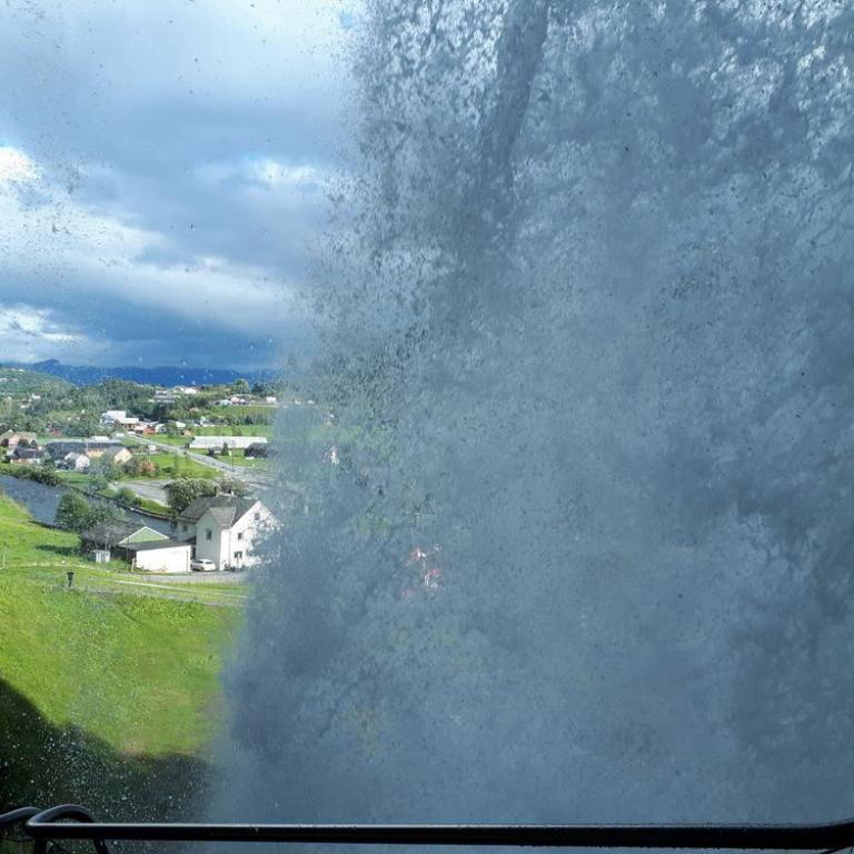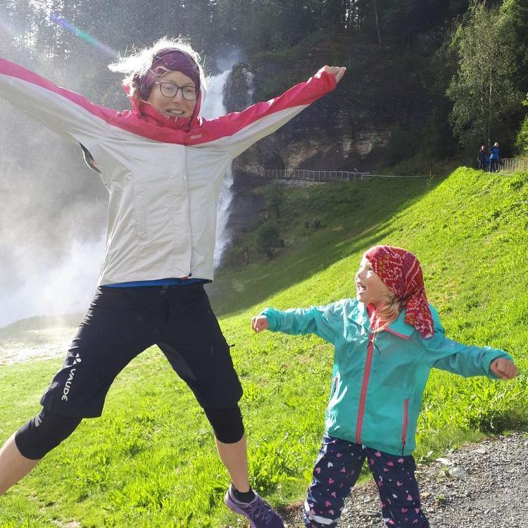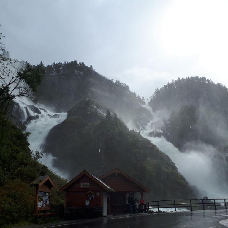 Wasserfälle, Panoramastraße, MTB zum Steinsdalfoss: Am Morgen packten wir früh unsere Sachen zusammen und kamen ausnahmsweise zeitig weg. Es war bewölkt, aber regnete nicht. Diesmal fuhr Brigitte, damit ich Fotos machen konnte. Der Weg war das Ziel. Die knapp 60 km Passstraße zwischen Sauda und Roldal ist wohl die aufregendste Straße in Südnorwegen. Streckenführung, Höhe, Luft, Landschaft alles ist dramatisch. Wir überquerten 2 Stauseen, einen direkt auf der Staumauer, stiegen Serpentinen bis 1000 m hoch. Teilweise regnete es, teilweise blitzte die Sonne hervor. Wir fuhren vorbei an kristallklaren Bergseen an vielen Schneefeldern und auch Schafe lagen immer wieder auf der Straße. Wir bogen bei Hara nach links in Richtung Hardangerfjord und hielten am Latefossen, einem 165 m hohen Doppelwasserfall. Bei Odda bogen wir ab und fuhren an der Westseite des Sorfjord bis nach Utne, wo wir mit der Fähre den Hardangerfjord bis Kvanndal überquerten. Von hier fuhren wir eine Panoramastraße bis nach Nordheimsund. 4 Kilometer südlich davon bekamen wir die bisher am schönst gelegensten Hütte in der wir bisher waren. Die Hütte selbst war ebenfalls super gemütlich und top eingerichtet. Besser geht nicht. Auch diese Hütte kostete 800 NOK, was sie aber mehr als wert war. Das Wetter war super, somit entschlossen wir uns mit dem Rad zum 7 Kilometer entfernten Steinsdalfoss zu radeln. Der Wasserfall war riesig und ein kleiner Weg führte uns hinter den Wasserfall. Tosend brauste das Wasser direkt vor uns in die Tiefe. In einem Souvenirladen direkt davor gab es ein leckeres Eis und wir fanden auch Mitbringsel für die Omis und Opis. Zurück in der Unterkunft machte Brigitte Abendessen, Timi schlief im Babyjogger am MTB und Emma und ich kraxelten auf den Steinen am Fjord. Nach dem Abendessen gab es dann Champions League. Zufälligerweise, hatte die Hütte einen kleinen Fernseher und im norwegischen TV wurde das Spiel FC Bayern gegen Paris Saint-Germain auch noch übertragen. Mit Dosenbier und Bayernhandtuch bewaffnet saß ich gespannt vor dem Mini Fernseher. Das Bayern auch noch 1 zu 0 gewann, war natürlich für mich als Bayernfan das Höchste. Triple hieß es dann für meinen Lieblingsverein