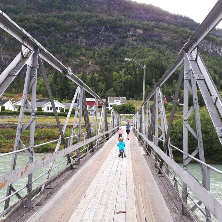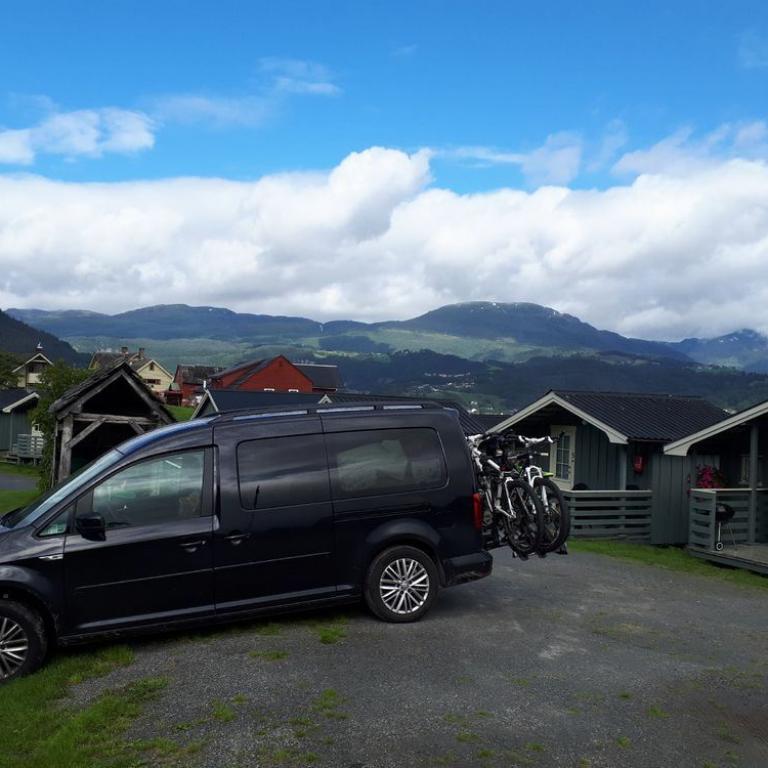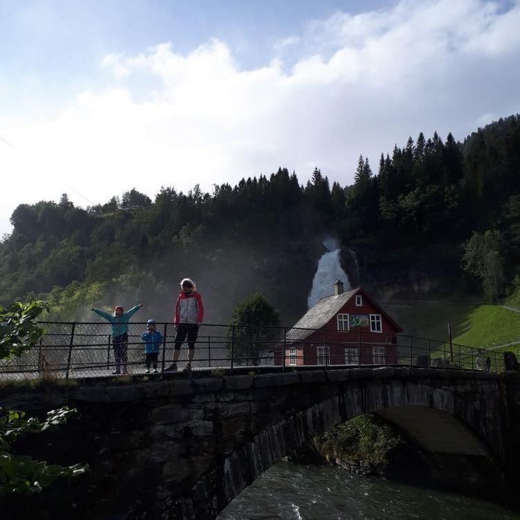 Bergstraße, Wasserfälle und MTB: Heute packten wir schnell zusammen, frühstückten und die Kinder durften noch an den Spielplatz. Um 10 Uhr waren die Winkls auch schon abfahrbereit :-) Unsere erste Station weiter in Richtung Norden war der Wasserfall Tvinnevoss. Wir bestaunten ihn direkt aus der Nähe. Weiter führte uns eine atemberaubende Serpentinenstraße bis auf 1000 m hoch. Wir kamen vorbei an Schneefeldern, Schafen, blauen und wahrscheinlich eiskalten Bergseen. Das Wetter war norwegisch und deshalb in meinen Augen traumhaft. Wir sahen blauen Himmel, weiße wie graue Wolken, etwas Regen und auch Sonnenschein. Der Kontrast bot herrliche Bilder zum Fotografieren. Wir kamen über einen Pass und fuhren dann in Tiefe bis nach Vik, wo wir für 200 NOK (20 Euro) die Hopperstad Stabkirche aus dem Jahr 1140 besichtigen konnten. Einst gab es über 1000 Stabkirchen. Davon sind in ganz Norwegen nur noch 28 erhalten. In Vangsnes bestaunten wir die 12 m hohe Fridtjov Torsteinsson Statue, die dem Helden der Island Saga gewidmet ist. Von der Anhöhe aus hatten wir einen herrlichen Blick auf den Sognefjord und den dahinterliegenden schneebedeckten Bergen. Mit der Fähre setzten wir nach Hella über, von wo wir an der Sognefjordküste entlang bis nach Gaupne fuhren. Hier fanden wir im Sandvik Pluscamp für 640 NOK (64 Euro) eine gemütliche Hütte. Das Wetter war super und der Tag war noch lang, somit machten wir einen kleinen Ausflug durch Gaupne. Timi fuhr mit seinem Puky Roller, Emma mit dem MTB und Brigitte und ich liefen. Wir drehten eine knapp 7 Kilometer Runde bis zum Fjord und zurück. An einem Spielplatz kraxelten und rutschten wir fleißig :-) Zurück in der Hütte kochte Brigitte leckere Spaghetti und ich drückte noch in 30 Minuten mit dem MTB fast 400 Hm einen Berg nach oben, von wo ich eine traumhafte Aussicht auf das Gletschergebiet hatte. Nach dem Abendessen genehmigten wir uns eine Dusche in den Sanitären Einrichtungen des Campingplatzes, bevor wir den Tag ausklingen ließen
