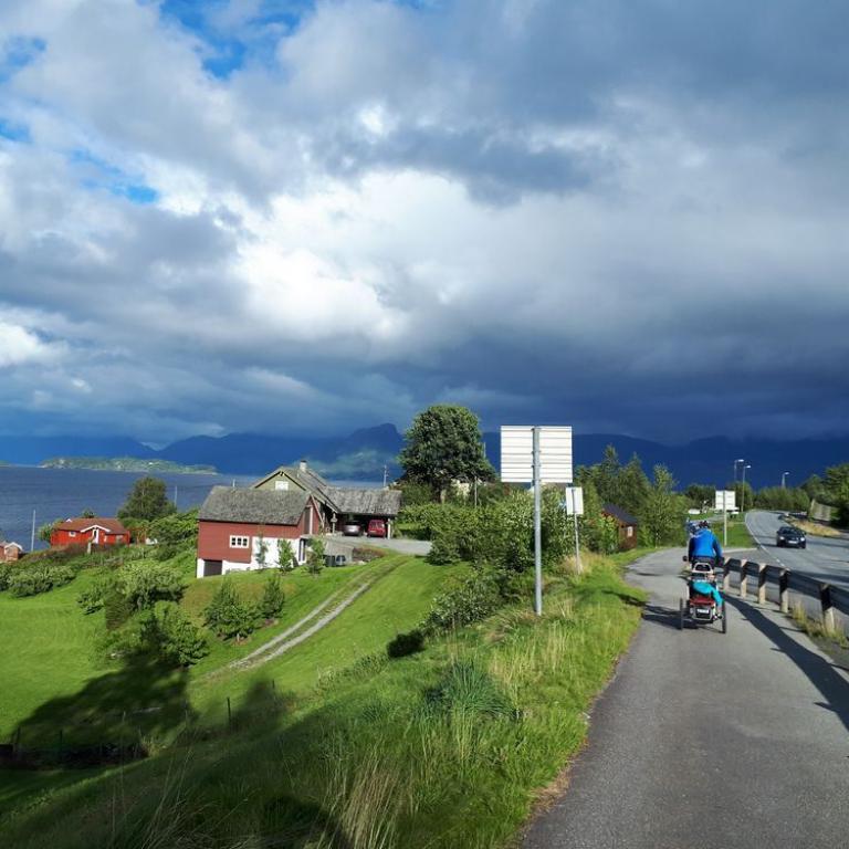 Am Morgen bekamen wir noch ein leckeres Frühstück in unserem First Hotel Aalborg. Dann machten wir uns auf die weitere Reise. Wir hatten noch 60 Kilometer bis nach Hirtshals, wo unsere gebuchte Fähre nach Norwegen schon wartete. Für 380 Euro bekamen wir eine Überfahrt bei Color Line bis Kristiansand, incl. 2 Wochen später der Rückfahrt. Wir waren frühzeitig am Fährhafen, so dass wir noch über eine Stunde im Auto warten mussten, bis wir auf die Fähre fahren durften. Wir genossen zuerst das schöne Wetter an Deck in der Sonne während der Abfahrt. Später gingen wir zu unseren gebuchten Sitzplätzen, wo die Kinder ein Nickerchen hielten und ich ein interessantes Buch las ("Mit 50 Euro um die Welt" von Christopher Schacht). Nach knapp 4 Stunden Überfahrt erreichten wir norwegischen Boden. In Kristiansand fuhren wir von der Fähre und hielten uns westwärts in Richtung Stavanger. Nach ca. 40 Kilometern erreichten wir unser heutiges Ziel, den herrlich gelegenen Campingplatz "Solstrand Camping" kurz nach Mandal in Vigeland am Snigsfjorden. Wir mieteten uns eine "Cabin" für ca. 80 Euro. Die kleine Hütte war perfekt für uns, mit 4 Betten, kleiner Küche, Terrasse und Toilette. Mit Emma auf dem Rad lief ich eine traumhafte Strecke bis zu einer kleinen Badebucht am Fjord. Hier hielten wir die Füße ins Wasser, genossen den Sonnenuntergang und kraxelten auf Bäume. Insgesamt waren wir knapp 8 Kilometer unterwegs. Zurück am Campingplatz sprang ich noch in das angenehm kühle Wasser des Fjords. Den Abend ließen wir bei einer Radler und einem Film gemütlich ausklingen