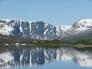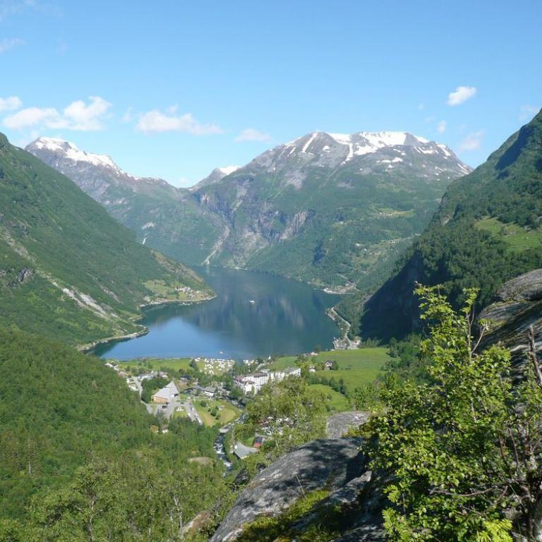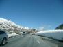 Um halb 9 Uhr machten wir uns wieder auf die Achse. Das Wetter war herrlich, nur blauer Himmel und Sonne. Wir fuhren zuerst nach Osten auf der E15 bis es auf die Rv 63 in Richtung Geirangerfjord ging. Gut 60 Kilometer fuhren wir durch eine hinreißende Landschaft. Schneebedeckte Berge links und rechts, immer wieder glasklare Bergseen und Sonne pur. Wir waren restlos begeistert von dieser Landschaft und wurden mit dem Fotografieren nicht mehr fertig.