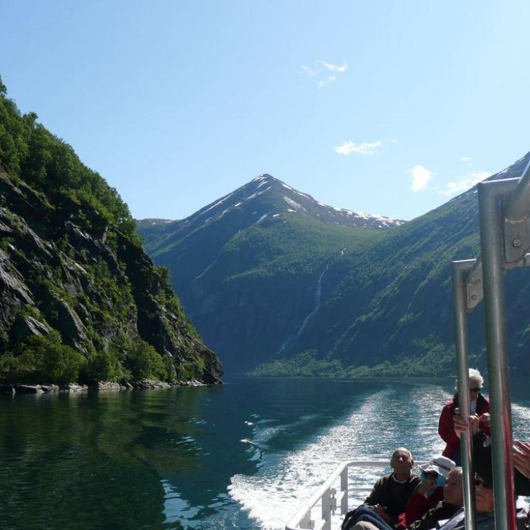 Dann kamen wir zu einem Aussichtspunkt auf den Geirangerfjord. Auch hier konnten wir wieder traumhafte Fotos machen. Geiranger selbst ist ein Touriort wie er im Buche steht. Hier buchten wir für 25 Euro pro Person eine 1 Stunden Tour auf dem Fjord. Auch diese Fahrt beeindruckte uns sehr. Der Fjord gehört zum UNESCO Weltkulturerbe mit seinen rauschenden Wasserfällen vor allem den "sieben Schwestern", den in die steilen Hänge gebauten Gehöften, den schneebedeckten Bergen und das ruhige Fjordwasser. Diese Fahrt gehört sicherlich zu dem Schönsten was man in Norwegen unternehmen kann.