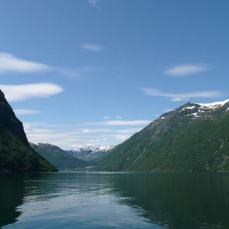 Um halb 9 Uhr machten wir uns wieder auf die Achse. Das Wetter war herrlich, nur blauer Himmel und Sonne. Wir fuhren zuerst nach Osten auf der E15 bis es auf die Rv 63 in Richtung Geirangerfjord ging. Gut 60 Kilometer fuhren wir durch eine hinreißende Landschaft. Schneebedeckte Berge links und rechts, immer wieder glasklare Bergseen und Sonne pur. Wir waren restlos begeistert von dieser Landschaft und wurden mit dem Fotografieren nicht mehr fertig.