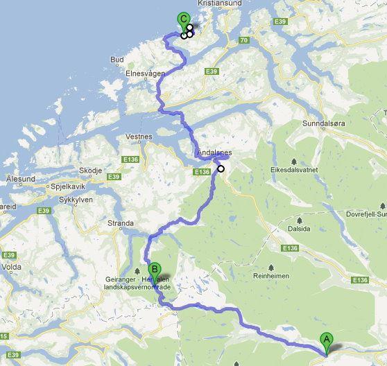 Auf der Rv 64 fuhren wir dann bis nach Afarnes, wo wir mit der Fähre nach Solsnes übersetzten. Weiter ging es dann Richtung Kristiansund, wo wir die Atlantikstraße, eine der schönsten Autostrecken der Welt, fuhren. Der 8,2 km lange Straßenabschnitt verläuft zwischen Vevang und Karvag. 12 Brücken verbinden die Inseln und Schären, was uns eine herrliche Fahrt ermöglichte.