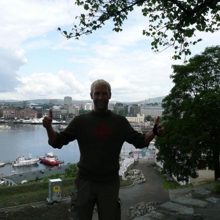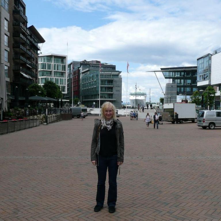 Wir fuhren gleich in das nächste Parkhaus und waren schon mal geschockt von den Preisen. Eine halbe Stunde parken kostete 5 Euro. Zuerst gingen wir durch das Einkaufzentrum Aker Brygge. Dort schauten wir uns die Preise der Lebensmittel an: McDonalds Cheesburger: 10 Euro, Brot 5 Euro, 1 Kg Tomaten 3 Euro, Pizza im Restaurant 20 Euro Auf jeden Fall werden wir so weit wie möglich auf größere Restaurantbesuche verzichten. Wir gingen zuerst am ungewöhnlichen Rathaus vorbei, weiter zur Burg Akershus, die noch immer unter Militärführung stand. Kurzzeitig regnete es etwas, aber es kam auch gleich wieder die Sonne heraus. In einer Bäckerei genehmigten wir uns ein Käse-Schinken Brötchen für 8 Euro.