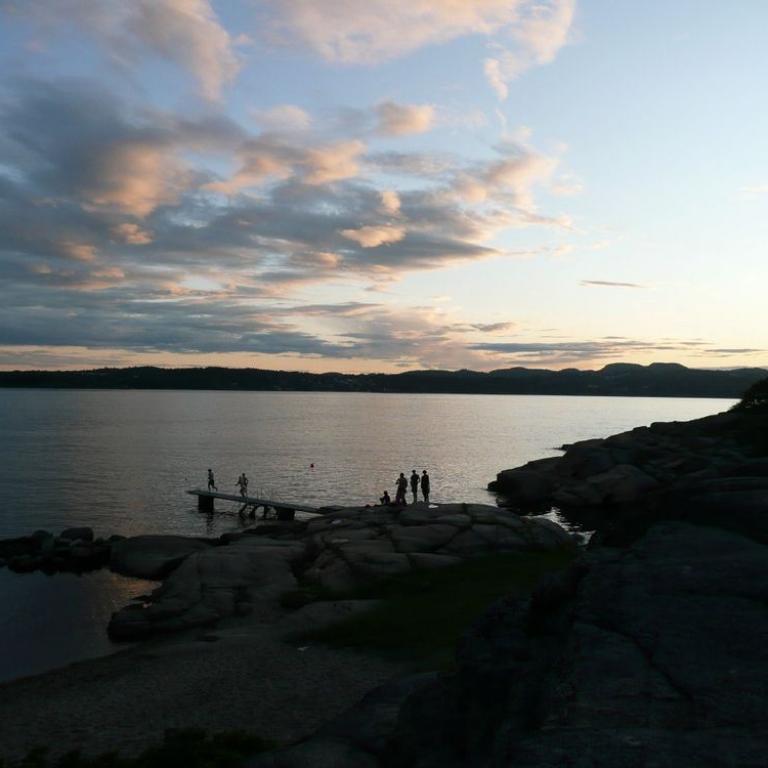 Nach kurzem Aufenthalt ging es weiter südlich bis Larvik. Dort fanden wir einen Campingplatz wo wir für 200 Nok`s (ca. 28 Euro) ein Zimmer in einer Holzhütte bekamen. Ok das Zimmer bestand aus 2 Betten mit Matratze, aber uns stand eine Küche zur Verfügung und Duschen. Zuerst zogen wir unsere Laufklamotten an und erkundeten die Gegend läuferisch. Wir hatten einen herrlichen Ausblick über den Fjord, aber auch die Wälder und Wiesen erstrahlten in saftigem Grün was uns faszinierte. Später kochten wir uns Nudeln in der Küche und bestaunten um halb 11 Uhr den Sonnenuntergang. Einheimische waren sogar um diese Zeit noch im Wasser. Geschafft von diesem langen Tag legten wir uns nieder.