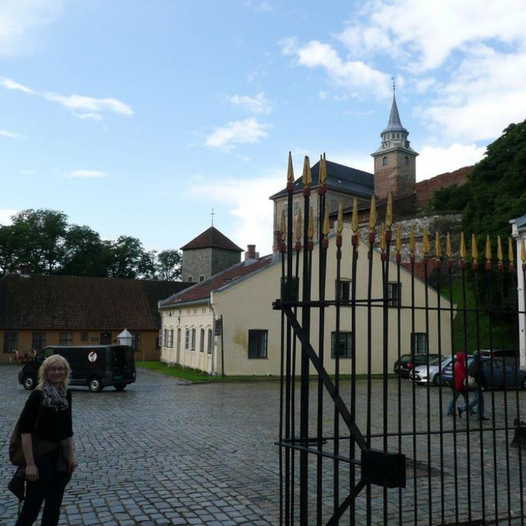 Wir fuhren gleich in das nächste Parkhaus und waren schon mal geschockt von den Preisen. Eine halbe Stunde parken kostete 5 Euro. Zuerst gingen wir durch das Einkaufzentrum Aker Brygge. Dort schauten wir uns die Preise der Lebensmittel an: McDonalds Cheesburger: 10 Euro, Brot 5 Euro, 1 Kg Tomaten 3 Euro, Pizza im Restaurant 20 Euro Auf jeden Fall werden wir so weit wie möglich auf größere Restaurantbesuche verzichten. Wir gingen zuerst am ungewöhnlichen Rathaus vorbei, weiter zur Burg Akershus, die noch immer unter Militärführung stand. Kurzzeitig regnete es etwas, aber es kam auch gleich wieder die Sonne heraus. In einer Bäckerei genehmigten wir uns ein Käse-Schinken Brötchen für 8 Euro.
