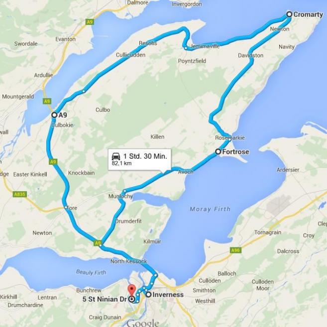 Da wir ohne Frühstück gebucht hatten, fiel dies für uns zuerst aus, natürlich nicht für Emma. Ich schrieb noch meinen Reisebericht, aber dann konnte es auch schon los gehen. Wir fuhren durch Inverness und weiter in Richtung Norden zur Black Isle - Eileann Dubh. Die Insel hat die niedrigste Niederschlagsrate von Schottland und ein sehr mildes Kilma. Wir fuhren zuerst durch Avoch und Fortrose bis wir in Cromarty ankamen.