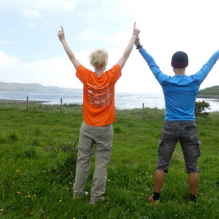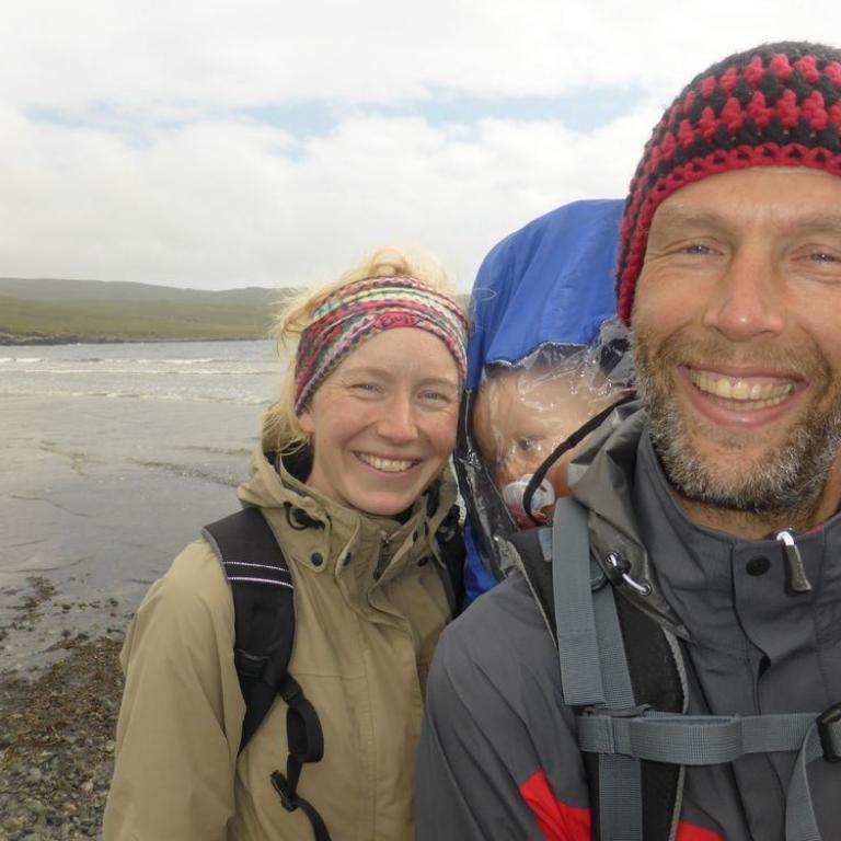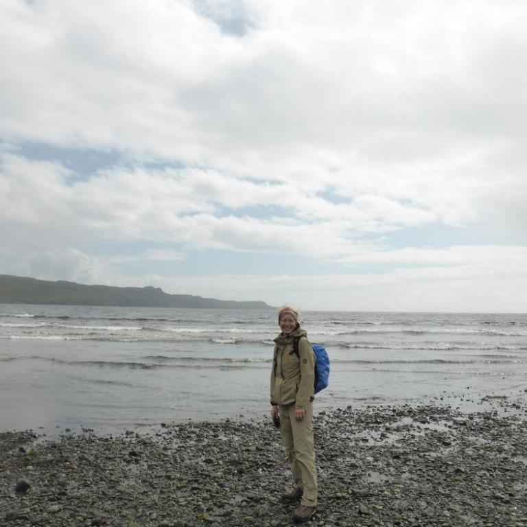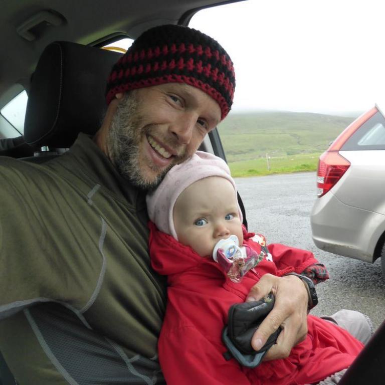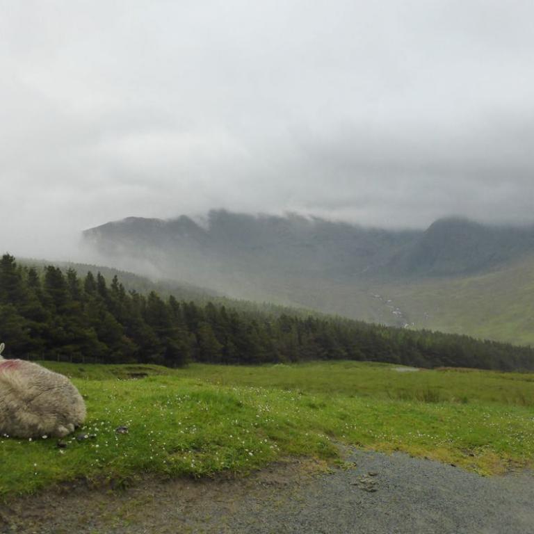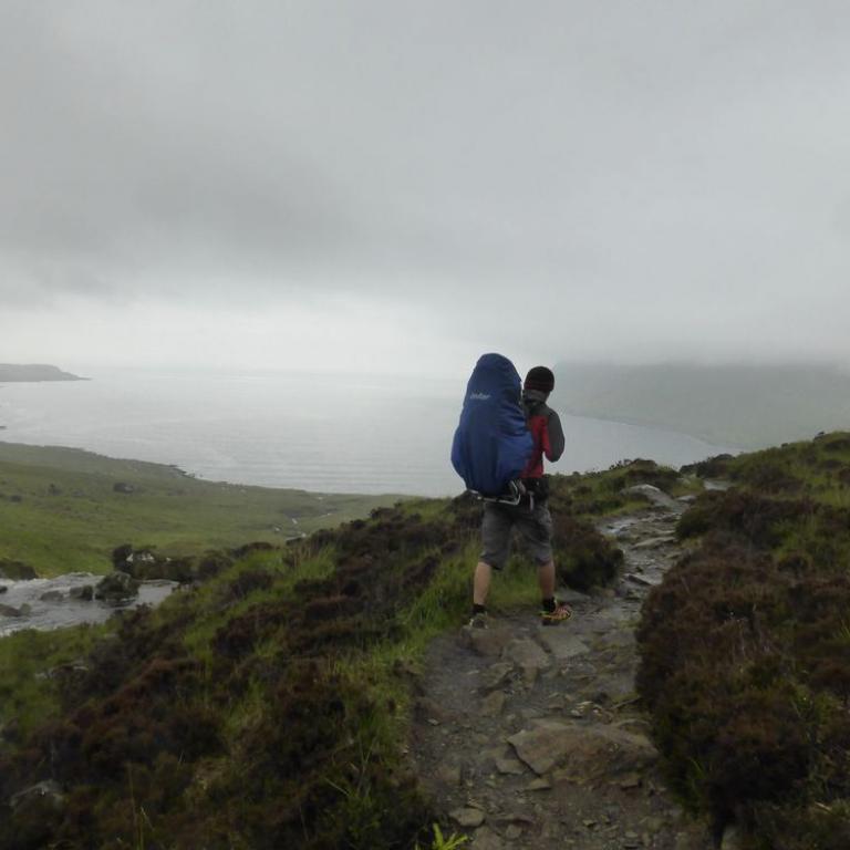 Wir gelangten über eine atemberaubende Straße bis nach Glenbrittle. Am Strand parkten wir und gingen in Richtung Westflanke der Cuillins, die in Wolken lagen. Wir wanderten mit Emma in der Kraxn nach oben. Ein kleiner, matschiger Pfad führte uns über kleine Bäche und herrliche Wiesen in Richtung eines Hochplateaus. Leider fing es stärker zu Regnen an und wir entschlossen uns auf ca. 300 Höhenmeter umzukehren. Wieder am Strand angekommen kam die Sonne heraus und blauer Himmel blitzte durch die Wolken.