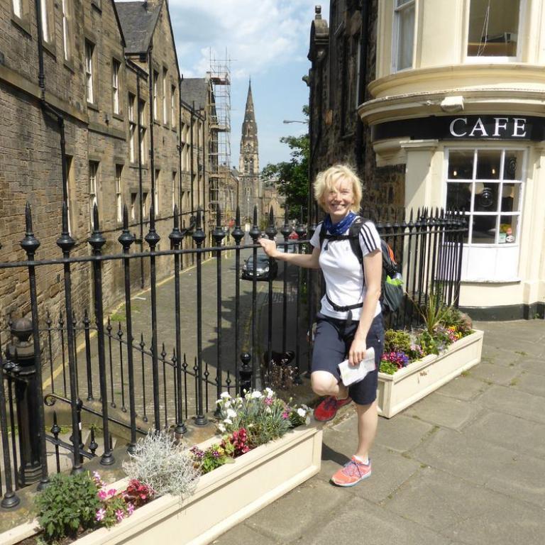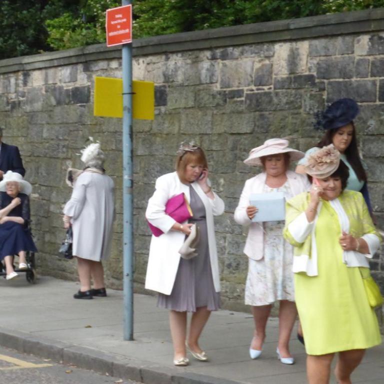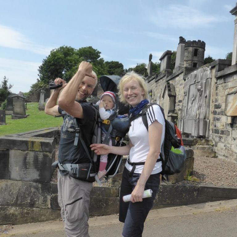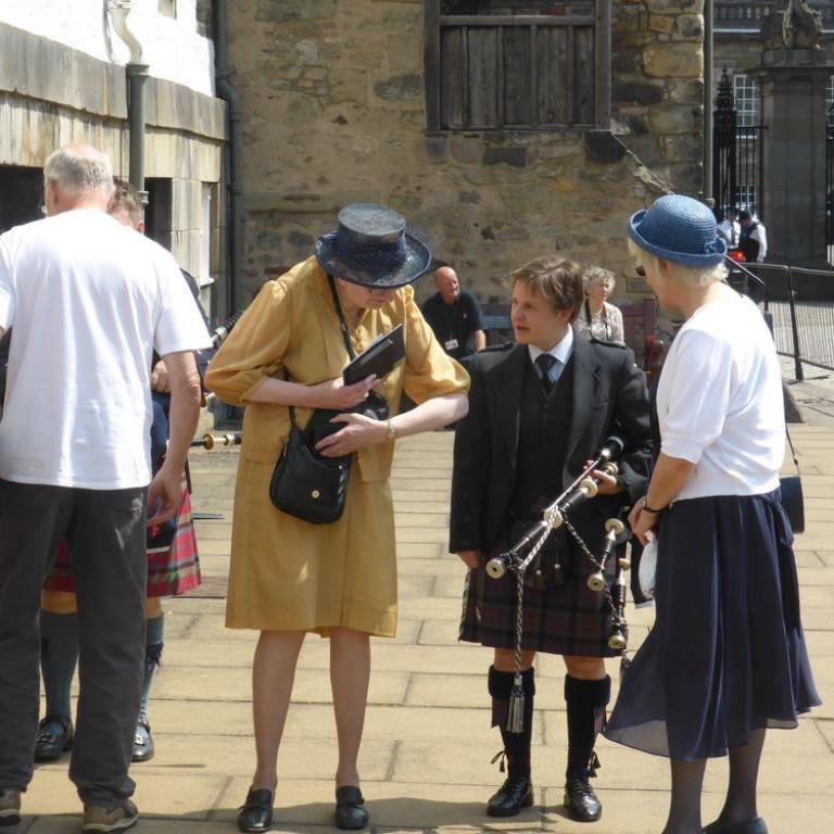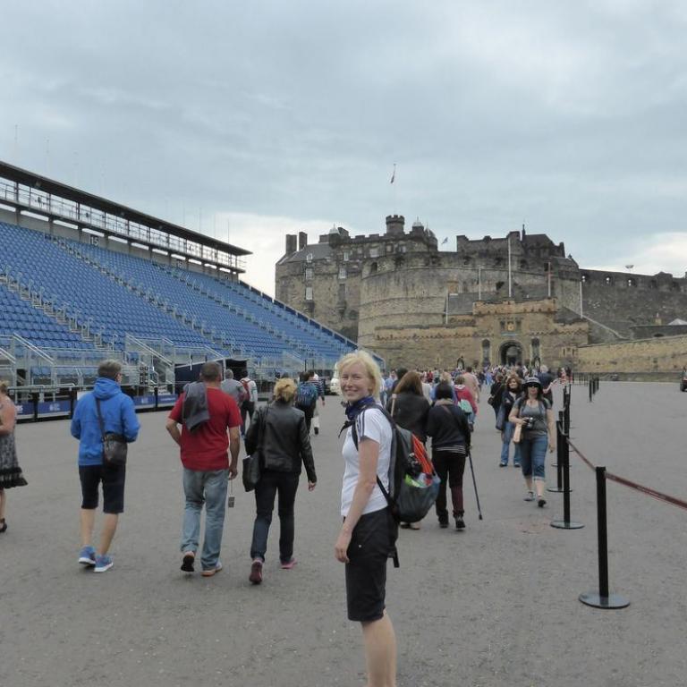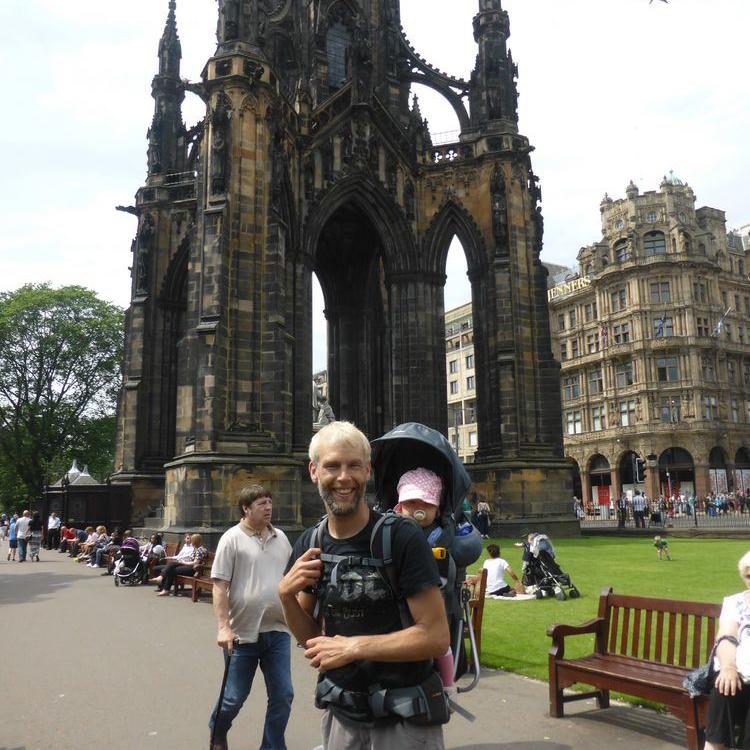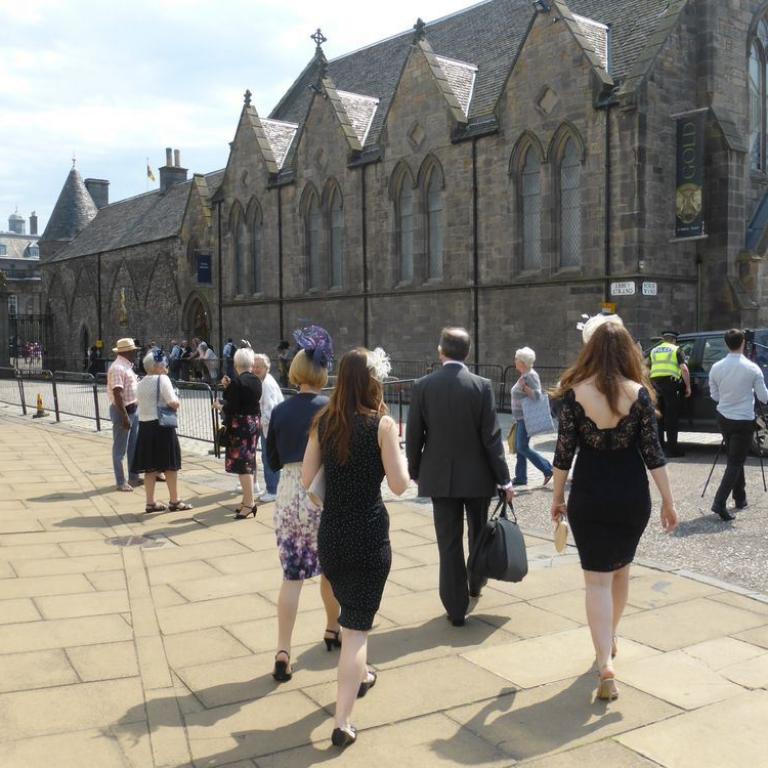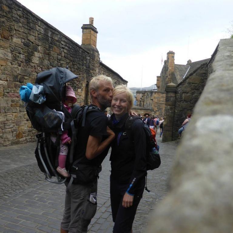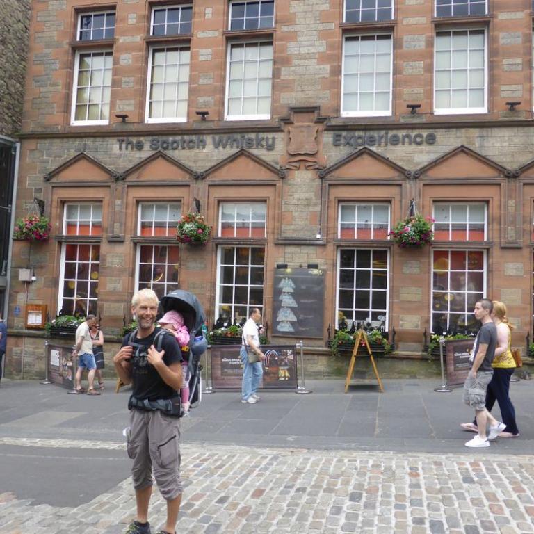 Wir marschierten mit Emma in der Kraxn los in Richtung Zentrum. Nach ca. 30 min erreichten wir unser erstes Ziel, das Palace of Holyroodhouse. Ein Palast für rauschende Feste aus dem 16. Jahrhundert und Zufluchtsort von Maria Stuart. Leider durften wir nicht nahe heran, da aktuell die Königsfamilie anwesend war. Alles war abgesperrt. Es liefen viele lustige Gestalten umher, viele Damen in viel zu engen und farblich nicht passenden Kleidern mit komischen Hüten und die Männer im Schottenrock. Anscheinend war auch irgendeine Veranstaltung, auf der sicherlich der Möchtegernadel und auch die königliche Familie vorhanden waren. Leider bekamen wir keine Einladung, was ich ganz und gar nicht verstand :-)