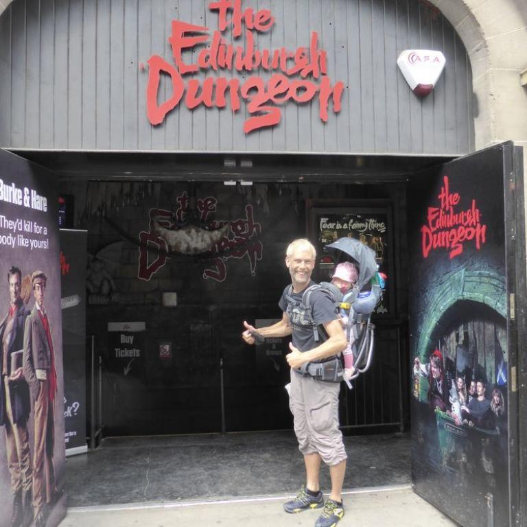 Wir marschierten in Richtung Castle und kamen am Edinburgh Dungeon vorbei, wo die dunkelsten Kapitel Schottlands mittels Schautafeln und lebenden Figuaren dargestellt wird. Wir waren uns nicht sicher ob das auch was für unsere kleine Maus war und fragten vorsichtshalber mal nach. Uns wurde versichert das schon viele Babys im Dungeon waren, also entschieden wir uns auch für einen Besuch (15 Pfund/Person) was sich aber als Fehler herausstellen würde :-( Als erstes wurden wir in einen finsternen Gerichtssaal geführt und 3 Besucher wurden wegen Verbrechen auf lustige Weise angeklagt, aber immer wieder wurden wir mit lauten Geräuschen erschreckt. Emma hielt sich zuerst noch ganz tapfer, aber nach dem 3. Mörder und 10. unvobereitetem lauten Erschrecken, war sie ganz und gar nicht mehr begeistert :-) Wir entschieden uns die Tour abzubrechen und den Dungeon zu verlassen. Das war sogar für Emma, die nie was erschüttern kann zu viel. Im Souvenirshop war sie aber schon wieder von einer abgetrennten Hand in Stofftierform begeistert :-)