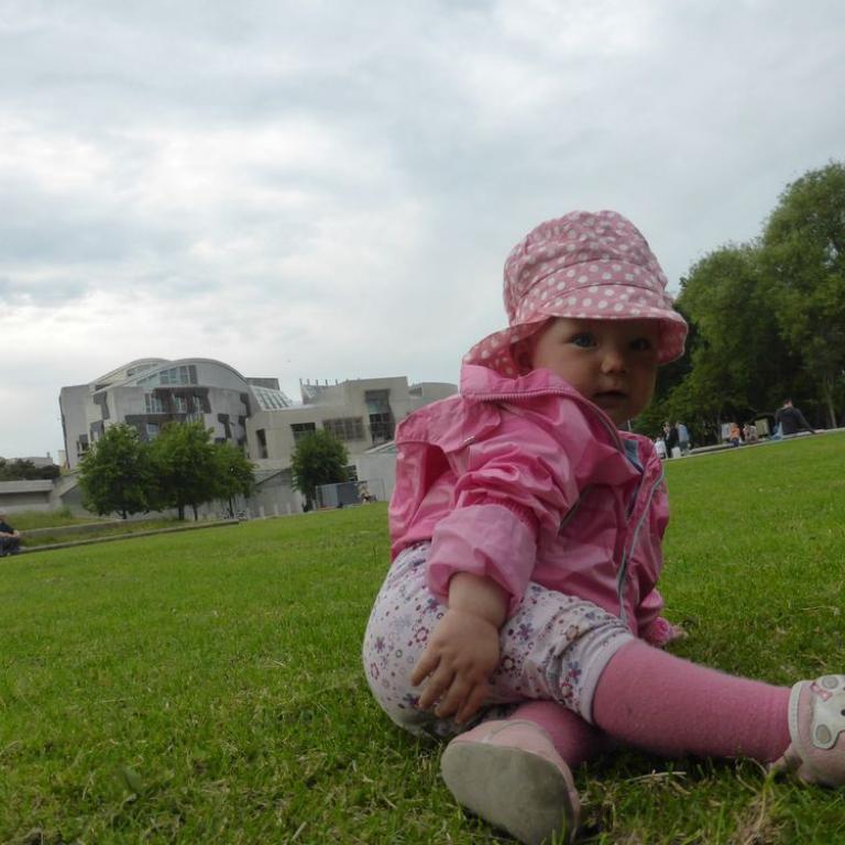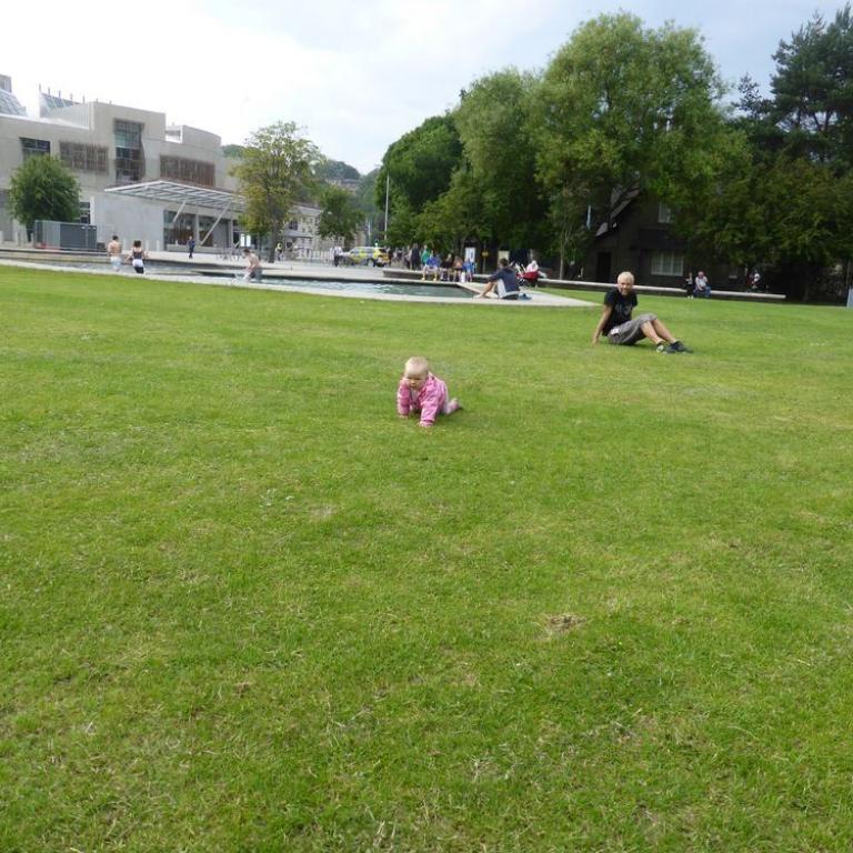 Am Ende der Royal Mile gelangten wir wieder zum Holyroodhouse wo sich mittlerweile noch mehr lustige Gestalten tümmelten :-) Emma durfte in einem Park in der Nähe krabbeln und lernte einen kleinen süßen Hund kennen :-)