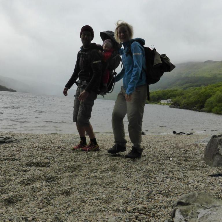 In unserem B&B waren wir die einzigen Gäste und wurden auch noch sehr freundlich behandelt. Um 8 Uhr gab es ein leckeres Frühstück, zuerst Früchte und frisch gepressten Saft und dann eine Art warmen Haferbrei und hausgemachtes Brot mit Marmelade. Danach fuhren wir an die Ostseite des Loch Lomonds bis ans Ende der ausgebauten Straße. Kurz nach dem Rowardennan Lodge gab es einen Parkplatz, von wo aus wir in Richtung Norden, zuerst am See wanderten. Leider war der ursprüngliche West Highlandway wegen Bauarbeiten geperrt, so das wir auf einen Forstweg ausweichen mußten. Nur selten hatten wir einen Blick auf den Loch Lomond und die umliegenden Berge. Nach ca. 1 1/2 Stunden kehrten wir um und gingen zum Ausgangspunkt zurück. Zwischenzeitlich hatte Emma Hunger und wir gaben ihr das Mittagessen, wo wir feststellten, das die kleinen Stechmücken, die Midges sehr böse und zahlreich waren. Trotz Mückenspray ließen sich die Teile nicht abschrecken. Nach knapp 3 Stunden Wanderung erreichten wir wieder den Parkplatz.