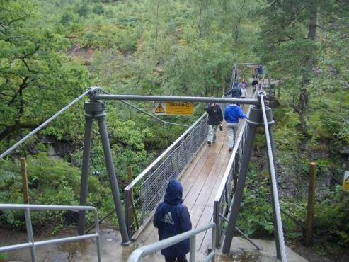 Auf der Straße 832 fuhr ich weiter die Küste entlang. Die Straßen sind teilweise nur einspurig. Aber immer wieder gibt es Ausweichmöglichkeiten. Hier ist es üblich sich ständig zu grüßen, wenn man sich an einer solchen Stelle begegnet. Einfach freundlich die Schotten. Immer wieder hatte ich herrliche Ausblicke auf die Gruinard Bay mit dem vorgelagerten Gruinard Island. Ich kam an Dundonnell vorbei mit breit ausgewaschenem Flußbett des Dundonell Rivers. Dannach geht es auf der Hauptstraße hinein in ein enges Tal mit rauschenden Wasserfällen und Mondlandschaft mit steil ansteigenden Gebirgszügen. Dann kommt ein romantischer Abschnitt durch den Dundonell Forest mit bemoosten Bäumen. Nach der Abzweigung der A 832 auf die A 835 nach Ullapool erreichte ich einen beschilderten Parkplatz zum Wasserfall von Measach. Ich wanderte ca. 20 Minuten auf einem Trampelpfad und erreichte dann den Wasserfall, der sich unter einer weiten Hängebrücke spektakulär durch die Corrieshalloch-Schlucht stürzt.