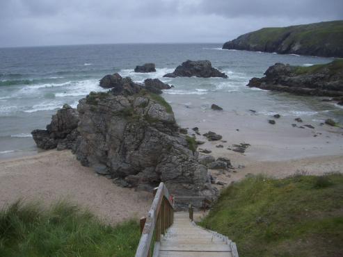 Nach dieser guten Mahlzeit machte ich mich gestärkt auf, weiter in Richtung Norden. In Durness machte ich kurz Halt. Durness besteht aus einer Reihe verstreut liegender Siedlungen, die sich gemütlich in einer weiten Senke ausdehnen. Leider war es eiskalt und ziemlich windig. Auch ein paar Regenschauer gab es immer wieder. Bei schönem Wetter wäre der Strand herrlich gewesen.