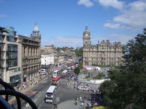 Nach einigen Gehminuten und unzähligen Fotos erreichte ich den Palace of Holyroodhouse. Den Eintritt konnte ich mir verkneifen, da er 14 Pfund kostete. Ich machte durch die Gitterstäbe ein paar Fotos vom Vorhof des Palastes. Dieser war bekannt für rauschende Feste und hinterhältige Morde. Sehenswert sollen die prachtvollen Staatsgemächer, Möbel aus dem 18. Jh., flämische und französische Gobelins und die umstrittene Porträtsammlung von 112 schottischen Regenten, sein. In großen Gruppen werden die Besucher am Thronsaal und den Privatzimmern von Königin Maria Stuart vorbeigeschleust. Von hier aus marschierte ich über die Carlton Road in die Princes Street. Nun war ich in der New Town, das Gegenstück zur lengendenumworbenen Altstadt: klassizistische Gebäude aus dem späten 18. Jh., aufgereiht in streng symetrischen Straßenzügen. Hier befinden sich elegante Geschäfte, teuere Kaufhäuser und eine Reihe von Luxushotels.