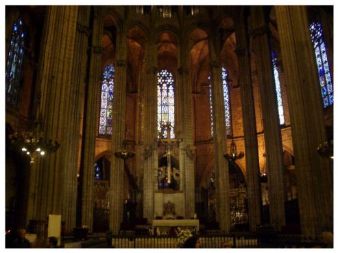 Vorbei am Aquarium (Von Haifischen bis hin zu Seepferdchen erwarten mehr als 10.000 Tiere und Pflanzen die Besucher), welches das größte Europas ist, schlenderten wir weiter Richtung Altstadt. Wir kämpften uns durch kleine Gassen mit hübschen und teilweise ungewöhnlichen Geschäften weiter, bis wir die Kathedrale Santa Eulalia im gotischem Viertel Barri Gotic erreichten. Leider wurde diese gerade renoviert und war somit ziemlich eingerüstet. Trotzdem konnten wir die gotische Baukunst im Inneren der Kirche bestaunen. 1298 wurde mit dem Bau begonnen, der sich bis 1454 hinstreckte. Fertig gestellt wurde sie erst zu Beginn des 20. Jahrhunderts. Über weitere Gassen gelangten wir dann wieder zur Placa Catalunya.