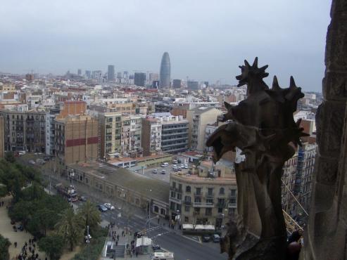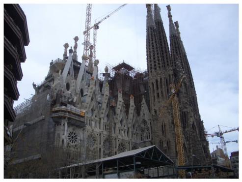 Der Bau wurde im Jahre 1882 begonnen. Antoni Gaudi arbeitete daran 40 Jahre lang, bis zu seinem Tod (überfahren von einer Straßenbahn) im Jahre 1926. Es wurden bis heute 8 der 12 Glockentürme der Fassaden gebaut. Das Gewölbe des Hauptschiffes ist vollendet und jetzt wird haupsächlich im Bereich des Kreuzgangs gearbeitet. Mit dem Aufzug (2 Euro) fuhren wir in luftige Höhe. Wir hatten eine wunderbare Aussicht auf ganz Barcelona. Über steile Wendeltreppen gelangten wir dann wieder nach unten. Immer wieder hatten wir einen tollen Ausblick. Die Sagrada Familia ist eine Einsiedlerhöhle, wie auch ein futuristischer Turm, den man gesehen haben muß. Durch einen Souvenierladen gelangten wir wieder ins Freie, wo wir mit dem Bus zur nächsten Sehenswürdigkeit fuhren.