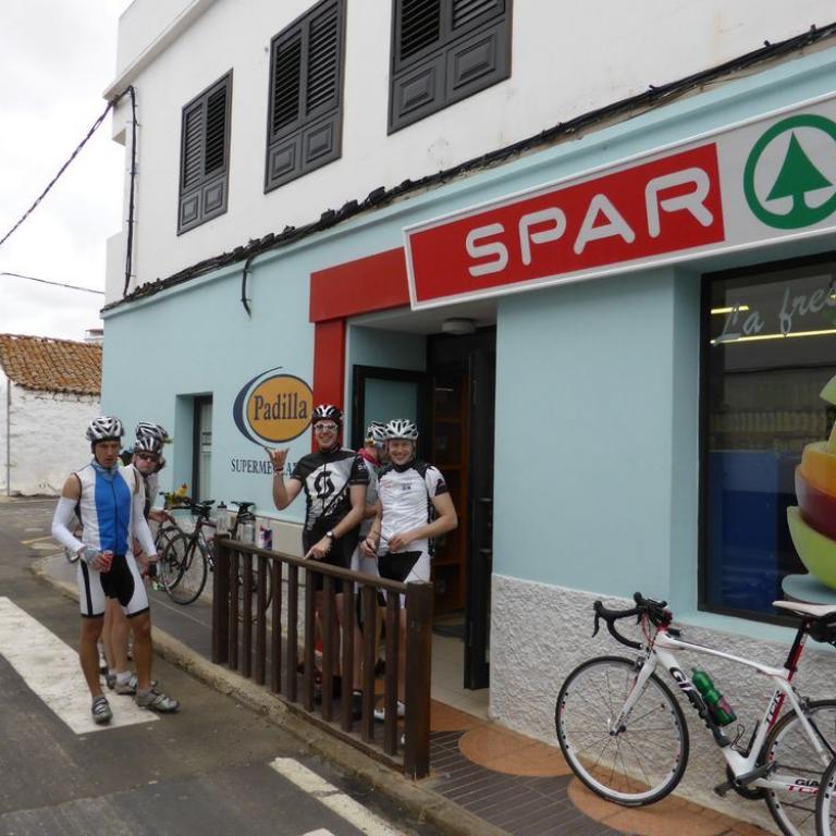 Gleich nach dem Frühstück saßen wir auch schon auf unseren Rädern. Ziel war der nördlichste Norden der Insel: Corralejo. Ich fuhr mit Mane, Wolfi, Done, Silvia und Jörg. Nach knapp über 3 Stunden erreichten wir den Ferienort im Norden. Gleichzeitig kamen auch Ralf und Christian, die noch einen kleinen Umweg gefahren sind, an. Wir kauften einen Supermarkt "leer" und machten noch ein gemeinsames Foto, bevor es wieder zurück zum Hotel ging. Diesmal mit Rückenwind, konnten wir zügig nach Hause gleiten. Insgesamt benötigten wir für die 157 Kilometer 1800 Höhenmeter 5 Stunden und 30 Minuten. Nach der nötigen Dusche trafen wir uns bei einem Bierchen am Pool. Brigitte war mittlerweile auch wieder von ihrer Wanderung nach Gran Tarajal zurück und gingen später dann gemeinsam zum Abendessen.