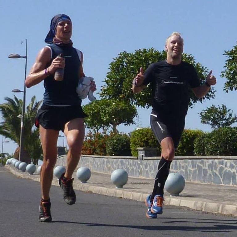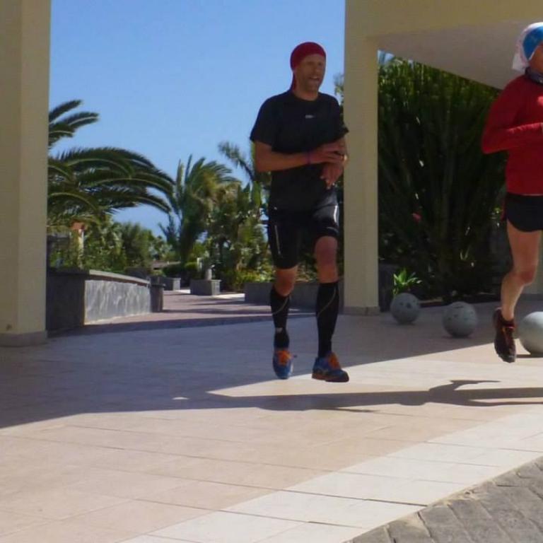 Ich fühlte mich gut und konnte 3 Mal die 3,2 Kilometer und 200 Hm in knapp 14 Minuten hinauf fahren. Beim 4. Mal fuhr ich Ralf entgegen und fuhr mit ihm hoch. Ralf und ich fuhren über Betancuria und Pajara zurück zum Hotel. Der Rest nahm den direkten Weg über Tuineje. Nach 95 Kilometern und 2500 Höhenmetern und 3 Stunden erreichten wir wieder unser Hotel. Ich zog gleich meine Laufschuhe an und startete zum Koppellauf. Ich fühlte mich gut und sauste zum 7 Kilometer und 250 Höhenmeter entfernten Leuchtturm. Hier holte mich Ralf ein und wir liefen zusammen wieder zurück. Total kaputt erreichten wir nach knapp 15 Kilometern im 4:40 Schnitt wieder unseren Ausgangspunkt. Das heutige Training zum Abschluss verlangte noch mal alles von mir, aber trotzdem machte das Ganze sehr viel Spaß. Vor allem weil ich merkte was ich für Fortschritte gemacht habe. Nach der wohltuenden Dusche trafen wir uns alle am Pool und genossen das ein oder andere kühle Blonde, bevor wir zum Abendessen gingen.