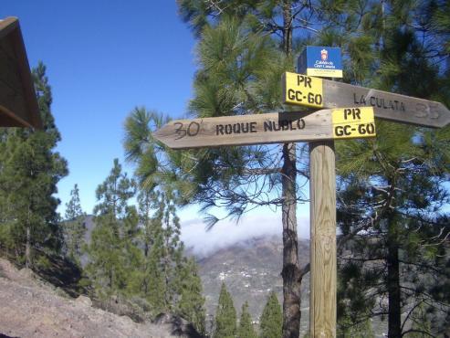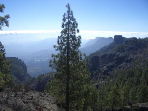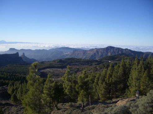 Der Weg führte uns in den Kiefernwald hinein. Nach 15 Minuten erreichten wir ein Holzkreuz. Der Blick schweift rechts hinüber in eine abgründige Schlucht, jenseits derer die höchsten Gipfel Gran Canarias aufragen. Nach ein paar weiteren Minuten kamen wir zur Passhöhe (1719 m) Degollada de los Hornos. Von hier aus hatten wir einen herrlichen Ausblick zum Roque Nublo und dem Pico de las Nieves. Geradeaus ging es weiter bis wir die Teerstraße erreichten.