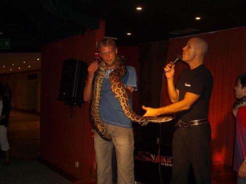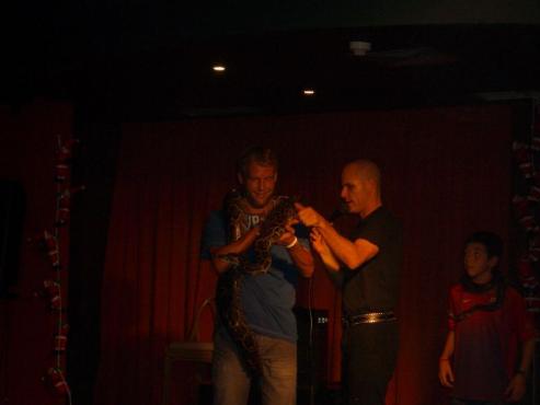 Nach dem Abendessen ging es noch in den hoteleigenen Club. Dort stand heute ein Schlangenbeschwörer auf dem Programm. Wie sollte es anders sein, er brauchte eine Person die sich zum Affen machte. Und da war ich anscheinend genau der Richtig. Im Rampenlicht wurde mir dann eine etwas größere Würgeschlange (45 kg) um die Schultern gelegt. Sie fühlte sich sehr weich und glatt an. Nach ein paar Minuten wurde ich dann wieder von der Bühne entlassen ohne einen Schaden davon erlitten zu haben............