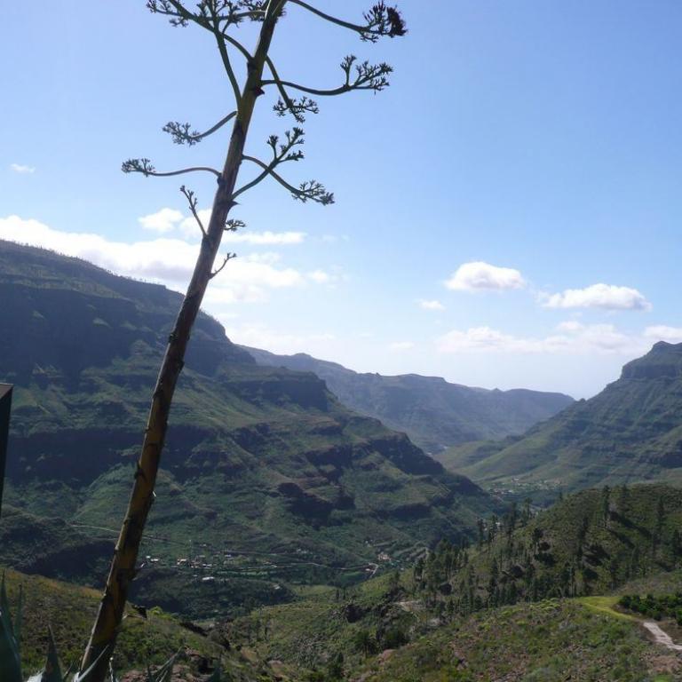 Der Blick schweift rechts hinüber in eine abgründige Schlucht, jenseits derer die höchsten Gipfel Gran Canarias aufragen. Nach ein paar weiteren Minuten kamen wir zur Passhöhe (1719 m) Degollada de los Hornos. Von hier aus hatten wir einen herrlichen Ausblick zum Roque Nublo und dem Pico de las Nieves. Geradeaus ging es weiter bis wir die Teerstraße erreichten. Der Weg schraubte sich doch relativ steil hoch zu Roque Nublo. Nach ca. einer halben Stunde erreichten wir das Hochplateau. Wir hatten eine herrliche Aussicht auf die bizarre Bergwelt und dem gigantischem Felsen Roque Nublo. Wir machten hier Rast und genossen die Sonne und Aussicht. Wir gingen den gleichen Weg wieder zurück, bis wir die Hauptstraße erreichten. Von dort ging es zuerst auf der Straße bergab, bis wir einen Trampelpfad nach Ayacata nehmen konnten. Nach insgesamt 4 Stunden reine Wanderung erreichten wir die kleine Ortschaft Ayacata, wo wir uns ein Getränk in einem Restaurant kauften, bevor uns eine nette Einheimische wieder zum Ausgangspunkt zurück brachte. Mit unserem Panda ging es wieder zurück ins Hotel. Leider wurden meine Halsschmerzen immer schlimmer, was natürlich meine Stimmung immer mehr vermieste. Nach dem Abendessen versuchte ich wieder einmal zu schlafen, was nur teilweise, dank des Hustens gelang.