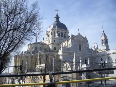 Gleich um die Ecke war auch schon der Haltepunkt und wir stiegen in den nächsten Bus. Wir bekamen einen Stadtplan und Kopfhörer für die Audiotour, natürlich auch auf Deutsch. Die heutige Fahrt führte uns durch das historische Madrid. Das Wetter war herrlich sonnig. Keine einzige Wolke am Himmel und auch relativ warm. Als erstes kamen wir am Palacio de Liria vorbei, dann ging es Richtung Westen zum Park De LA Montana und dann steuerten wir direkt auf den imposantem Königspalast Palacio Real zu. Vorbei an der Catedral de la Almudena (wurde 1993 nach 100 jähriger Bauzeit vom Papst geweiht) fuhren wir in die Gran Via de San Francisco, wo der mächtige Kuppelbau der Basilica de San Francisco el Grande aus dem Jahr 1774 steht. Einmal um den Platz Puerta de Toledo ging es wieder Richtung Norden bis wir in die Calle Mayor einbogen. Vorbei an dem historischem Plaza Mayor (Renaissancebau aus dem 18. Jahrhundert) ging es weiter zur Plaza Puerta del Sol, dem vitalem Mittelpunkt von Alt-Madrid.