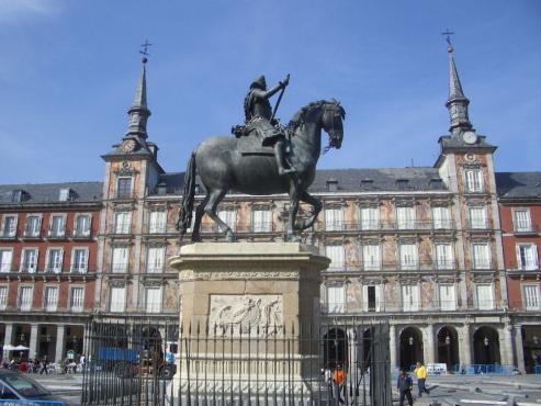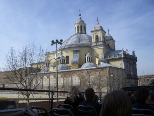 Gleich um die Ecke war auch schon der Haltepunkt und wir stiegen in den nächsten Bus. Wir bekamen einen Stadtplan und Kopfhörer für die Audiotour, natürlich auch auf Deutsch. Die heutige Fahrt führte uns durch das historische Madrid. Das Wetter war herrlich sonnig. Keine einzige Wolke am Himmel und auch relativ warm. Als erstes kamen wir am Palacio de Liria vorbei, dann ging es Richtung Westen zum Park De LA Montana und dann steuerten wir direkt auf den imposantem Königspalast Palacio Real zu. Vorbei an der Catedral de la Almudena (wurde 1993 nach 100 jähriger Bauzeit vom Papst geweiht) fuhren wir in die Gran Via de San Francisco, wo der mächtige Kuppelbau der Basilica de San Francisco el Grande aus dem Jahr 1774 steht. Einmal um den Platz Puerta de Toledo ging es wieder Richtung Norden bis wir in die Calle Mayor einbogen. Vorbei an dem historischem Plaza Mayor (Renaissancebau aus dem 18. Jahrhundert) ging es weiter zur Plaza Puerta del Sol, dem vitalem Mittelpunkt von Alt-Madrid.