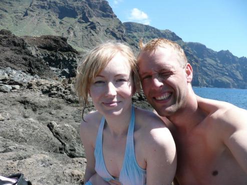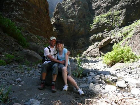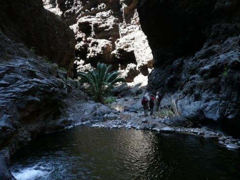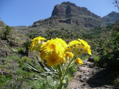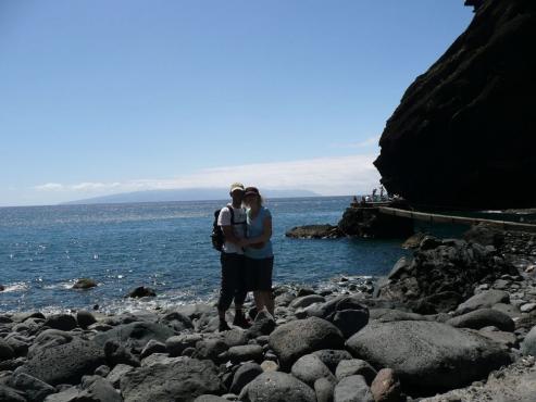 Von unserem Urlaubsort Playa de Fanabe fuhren wir mit dem Auto nach Masca. Hier startete unsere Wanderung auf 600 Höhenmeter. Links von der Kapelle geht es bergab in den Ortsteil, der auf einem Bergrücken liegt. Der Weg zweigt 10 Meter hinter einer Tafel und 30 Meter vor der Bar links ab. Es ging zwischen Agaven und Palmen bergab bis zum Bachbett. Alles blühte hier herrlich. Wir mussten eine Brücke überqueren, Felsen überwinden und teilweise durch kleine Spalten durchzwängen. Hier war immer wieder Trittsicherheit und Schwindelfreiheit gefragt. Links und rechts ragen riesige Steilwände empor. Einfach gigantisch diese Schlucht. Auch ein paar Kraxeleinheiten durften nicht fehlen, aber meistens ging es auf gemütlichen Wegen immer weiter abwärts Richtung Meer. Links, an der Mündung der Schlucht ins Meer, steht eine kleine Finca, rechts steht ein Felsen im Meer, zu dem ein schmaler Steg hinüberführt, wo die Boote anlegen. Wir gingen 100 Meter nach links, wo ein Sandstreifen zum Baden einlud. Die Wellen rissen uns um, aber es war lustig.