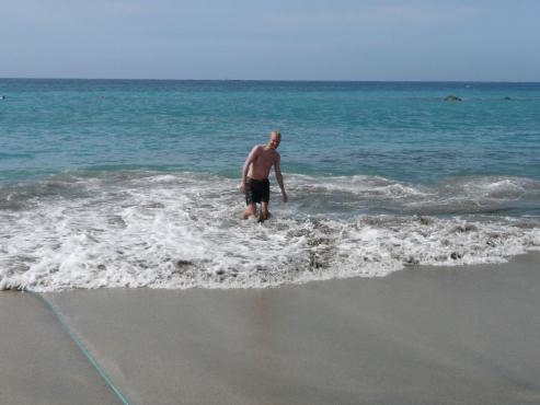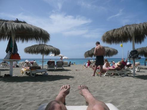 Am letzten Tag beschlossen wir, das wir uns gemütlich an den Strand legen. Zuerst suchten wir einen Geocach bei uns in der Nähe. Dann wanderten wir Richtung Norden die Küste entlang, bis wir an den Strand von Playa del Duque kamen. Hier mieteten (oder kauften??) für 18 Euo Liegen und einen Schirm. Das Wasser war kühl aber trotzdem klasse. Es gab herrliche Wellen, die über einen hinwegschwappten. Wir lasen und beobachteten die Leute am Strand. Zwischen durch gingen wir an der Küste weiter spazieren und kauften uns auch in einem Strandcafe ein kühles Radler. Am Abend gingen wir noch gemütlich zum Essen im Hotel.